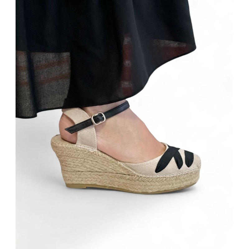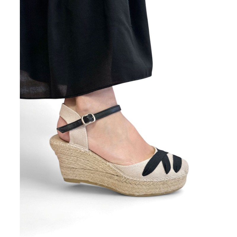 Alpargatas estilosas y artesanales. Jessi la alpargata de cuña con cierre de hebilla con un detalle bordado de punto de cruz en la pala. Tiene una altura total de 7 cm, de los cuales 5 cm pertenecen al tacón y 2 cm a la plataforma lo que hace que apenas notes la altura en tus metatarsos. Toda la cuña está hecha de yute y la planta interior está forrada en tejido acolchado. Este diseño está cosido a mano en España. La base de la suela es de goma antideslizante. Este modelo calza la talla habitual, si estás entre dos tallas te recomendamos escoger la más grande. Lo tenemos también en azul. Para cualquier look iras monísima.