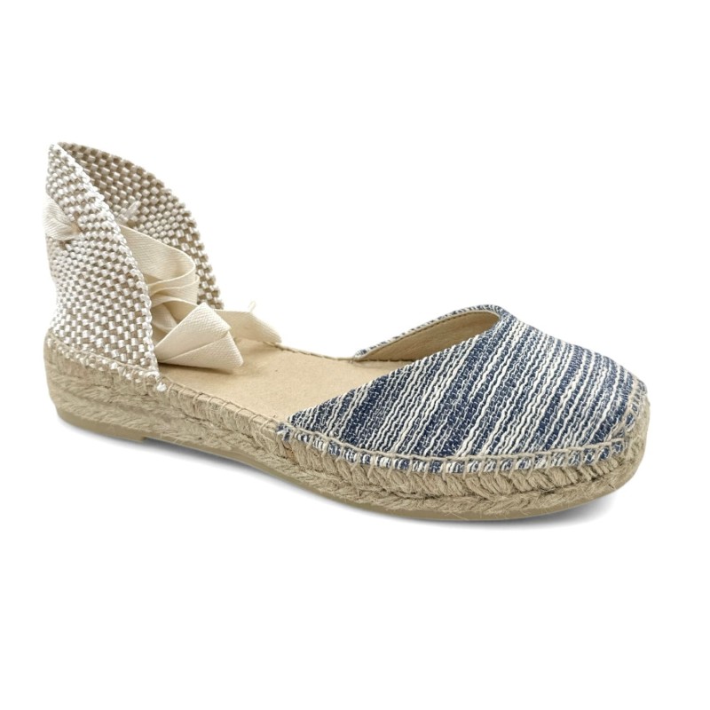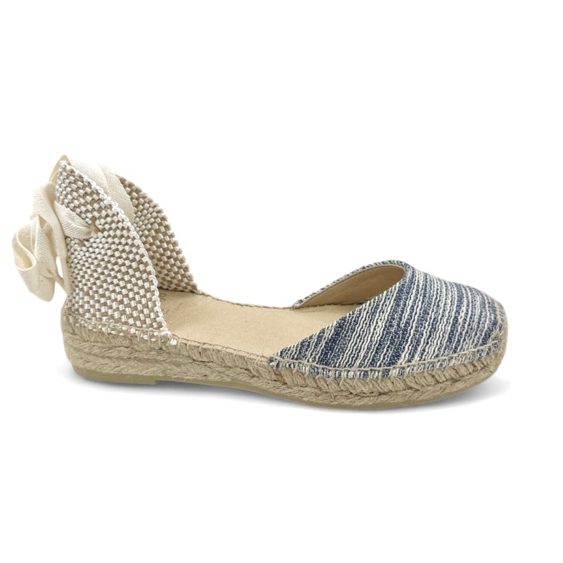 Alpargatas hechas a mano en La Rioja, de marca propia como antiguamente, con cariño y esmero puntada tras puntada. Fabricada en tejido natural tipo hilo de rafia suave entrelaza los colores del yute y el azul creando en la salida del empeine unos flecos dándole un toque precioso. Pala de caja cerrada que recoge el pie espectacular. Trasera taloncillo artesanal cerrado con cinta al azul para atar al tobillo. Suela recubierta de yute muy ligera y cómoda cuña 4 cuerdas en la delantera lo que lo hace mas confortable en su uso para los metatarsos. Plantilla acolchada interna y otra de microfibra transpirable, las notaras muy acolchada. Recomendamos al ponerla abrir su trasera hacia los lados para que la planta del pie se acomode perfecto. El remonte a la suela o cosido se realiza totalmente a mano, pasando por el proceso de forma de la alpargata calor y frio. Si tienes el pie ancho te recomendamos avisarnos y podemos moldearla con calor para darle un pelín mas de anchura. Recomendamos talla habitual. El color es como en la fotografía. Tambien la tenemos en suela mas alta.