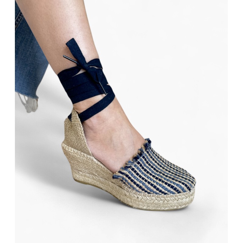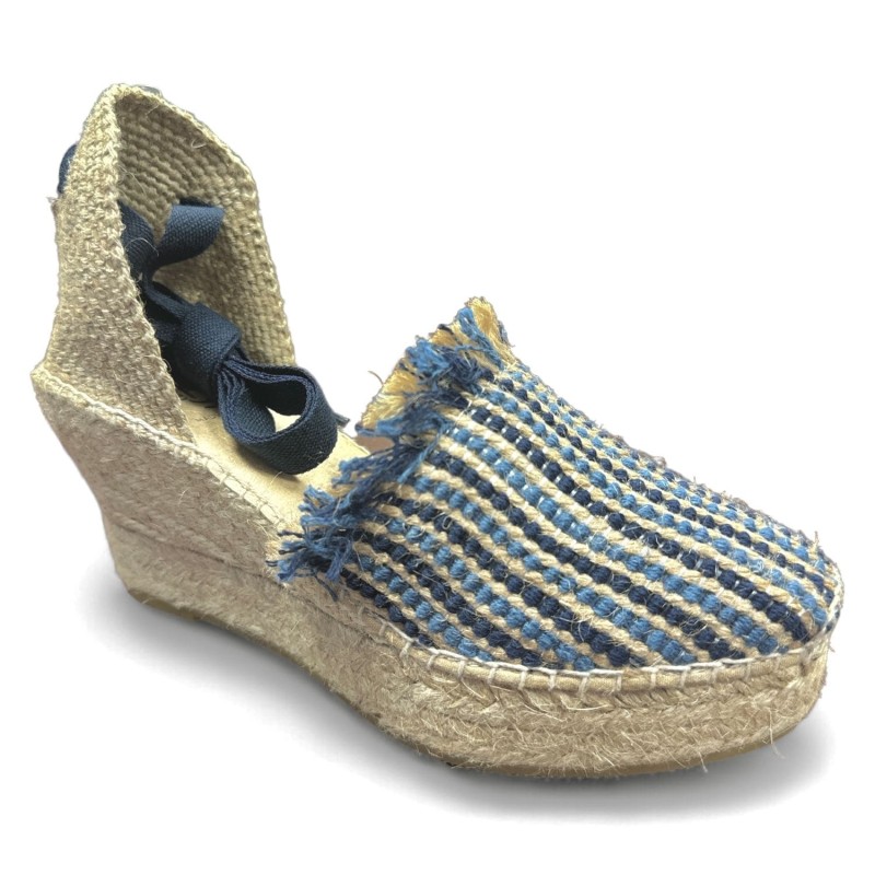 Alpargata de yute AnseRioja de fabricación propia en La Rioja. Fabricado en tejido transpirable de hilo mezclado azul, crudo. Estilo comodísimo que se adapta como un guante al pie gracias al remonte de hilo artesanal totalmente hecho a mano puntada tras puntada. Este modelo esta emplantillado con plantilla doble, una de espuma y otra de tejido transpirable lo que la hace muy acolchadita. Cosido artesanal a la suela para que se adapte mucho mas a nuestro pie. Cuña baja de dos cuerdas de yute natural y base de caucho antideslizante altura y piso plataforma. Sistema de ajuste mediante cintas para atar en el tobillo y le da un toque muy estiloso. La pala recoge bien el pie y su trasera es perfecta para ajustar al tobillo. Recomendamos tu talla habitual ya que luego se adapta la pie. Hecho en La Rioja. Si lo precisa por que tiene el pie ancho le podemos moldear en nuestra fabrica un poco mas su alpargata. Disponible por ahora en azul.