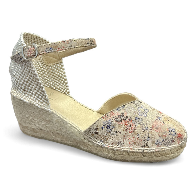 Modelo de alpargatas BERAL. Esta alpargata para mujer en ante bitono se elabora en tonos bicolor. La cuña de yute tiene una altura total de 7 cm, de los cuales 5 cm pertenecen al tacón y 2 cm a la plataforma casi no notara la altura. La base de la suela es de goma antideslizante y la suela interior está forrada en tejido de algodón acolchado para mayor comodidad. La talonera está elaborada en tejido trenzado y dispone de cierre de pulsera con hebilla. La puntera del zapato es cerrada. Se trata de una alpargata cosida a mano en España. Este modelo calza la talla habitual, si estás entre dos tallas te recomendamos escoger la más pequeña.