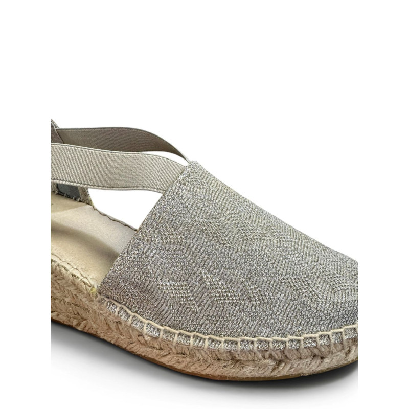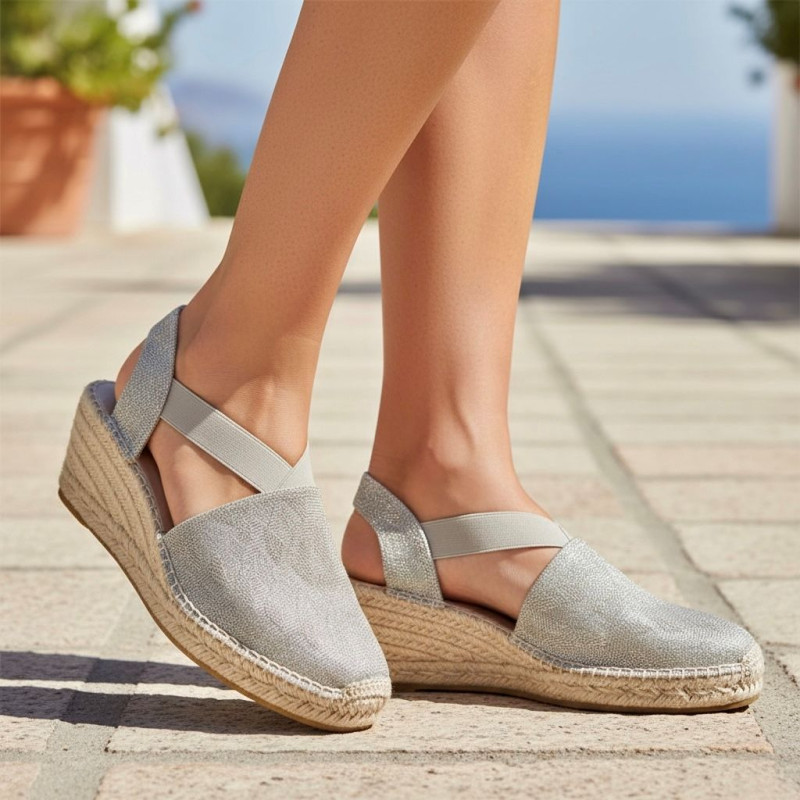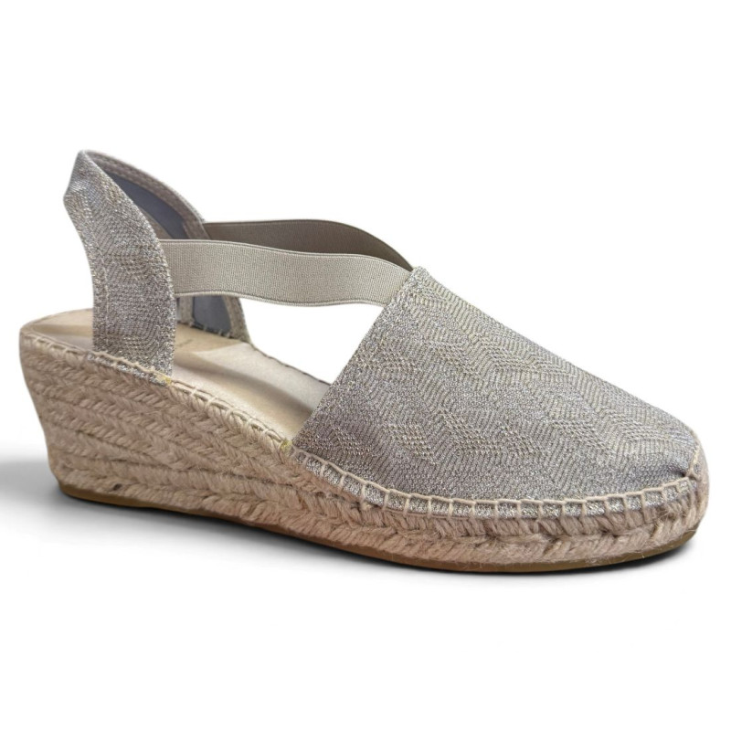 Alpargata artesanal Silvia te acompañara en los momentos mas especiales sin necesidad de sufrir por su alta comodidad. Esta alpargata con cuña está elaborada en tejido de algodón con un acabado brillante y super natural. La cuña de yute tiene una altura total de 9 cm, de los cuales 7 cm pertenecen al tacón y 2 cm a la suela lo que la hace mas cómoda y amortiguada gracias al yute. La base de la suela es de goma antideslizante. La plantilla interior está forrada en tejido, lo que le otorga una gran comodidad. La unión del tejido y la suela está cosida a mano con un hilo de algodón y tiene un refuerzo en la punta para mayor sujeción. Cuenta con dos tiras elásticas cruzadas en la pala del pie para una correcta sujeción. Este modelo calza la talla habitual, si estás entre dos tallas te recomendamos escoger la más grande. Hay que saber que la alpargata cosida a mano se adapta mejor al pie. Envíos 24-48 horas.