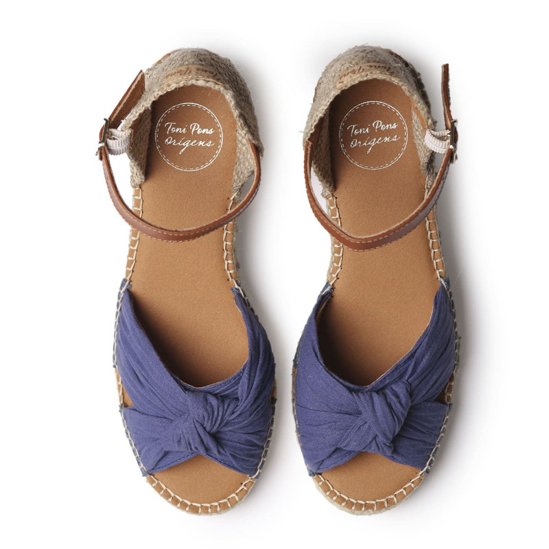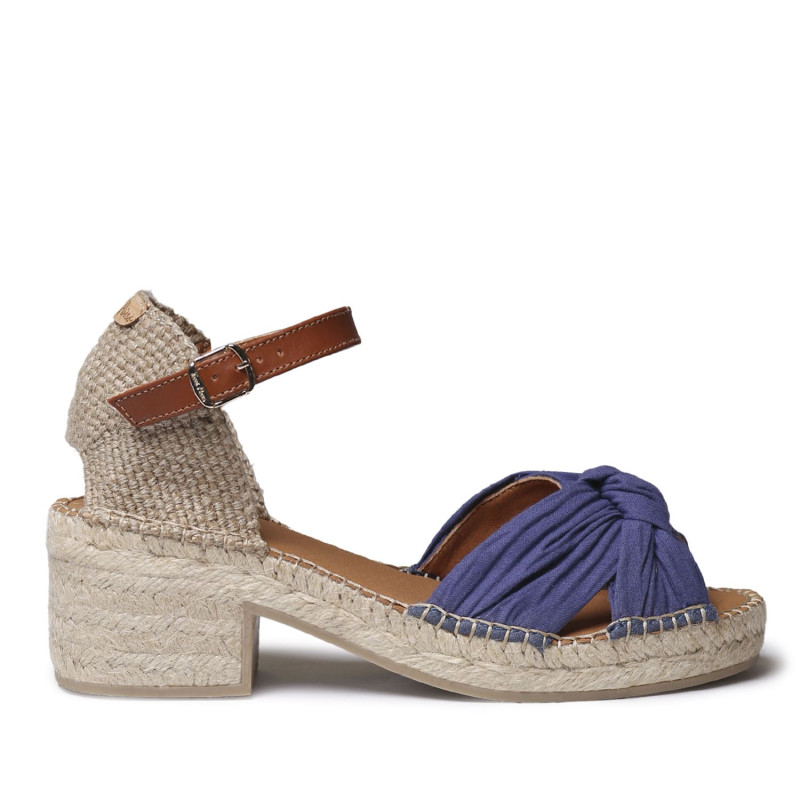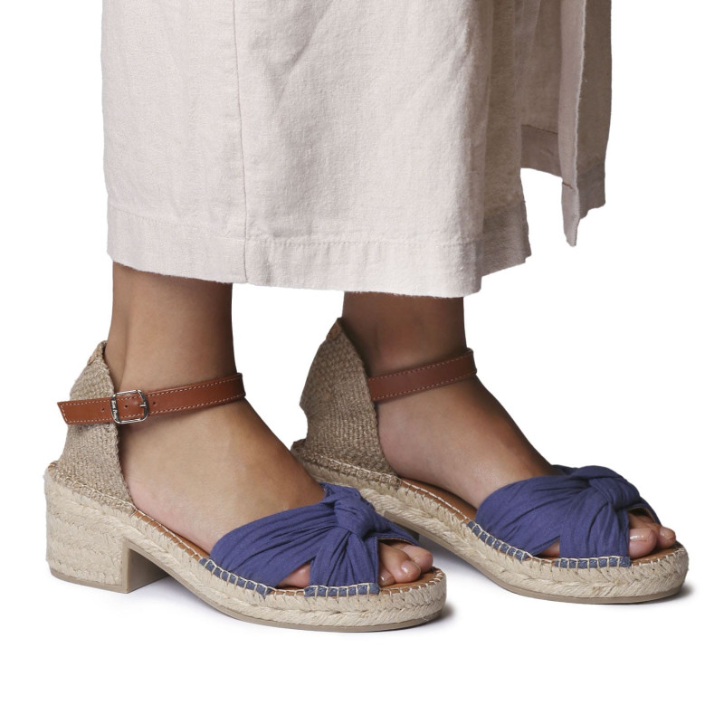 Alpargatas hechas a mano en La Rioja de marca propia como antiguamente, con cariño y esmero puntada tras puntada. Fabricada en tejido natural piqué tipo suave . Pala beige con pasados en marino con un formato que recoge el pie espectacular. Trasera tipo taloncillo hecho a mano en beige con cintas en azul y para atar al tobillo. Suela recubierta de yute muy ligera y cómoda cuña 5 cuerdas piso doble en la delantera lo que lo hace más confortable en su uso para los metatarsos. Plantilla acolchada interna y otra de microfibra transpirable, las notaras muy acolchada. Recomendamos al ponerla abrir su trasera hacia los lados para que la planta del pie se acomode perfecto. El remonte a la suela o cosido se realiza totalmente a mano, pasando por el proceso de forma de la alpargata calor y frío. Si tienes el pie ancho te recomendamos avisarnos y podemos moldear con calor para darle un pelín más de anchura. Recomendamos talla habitual.