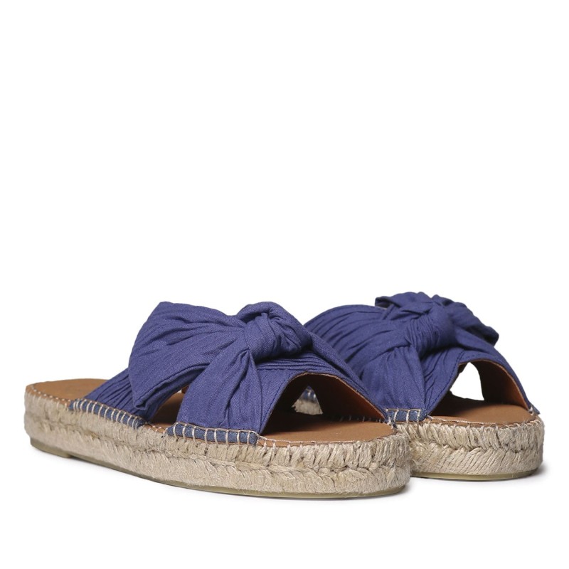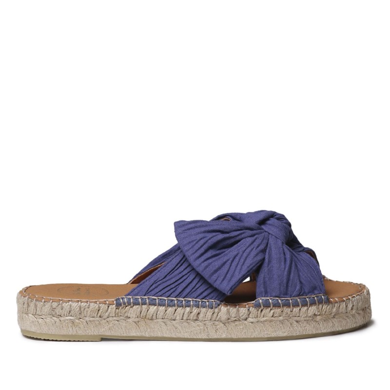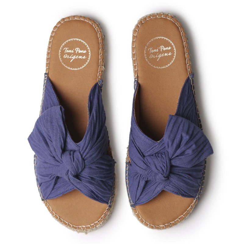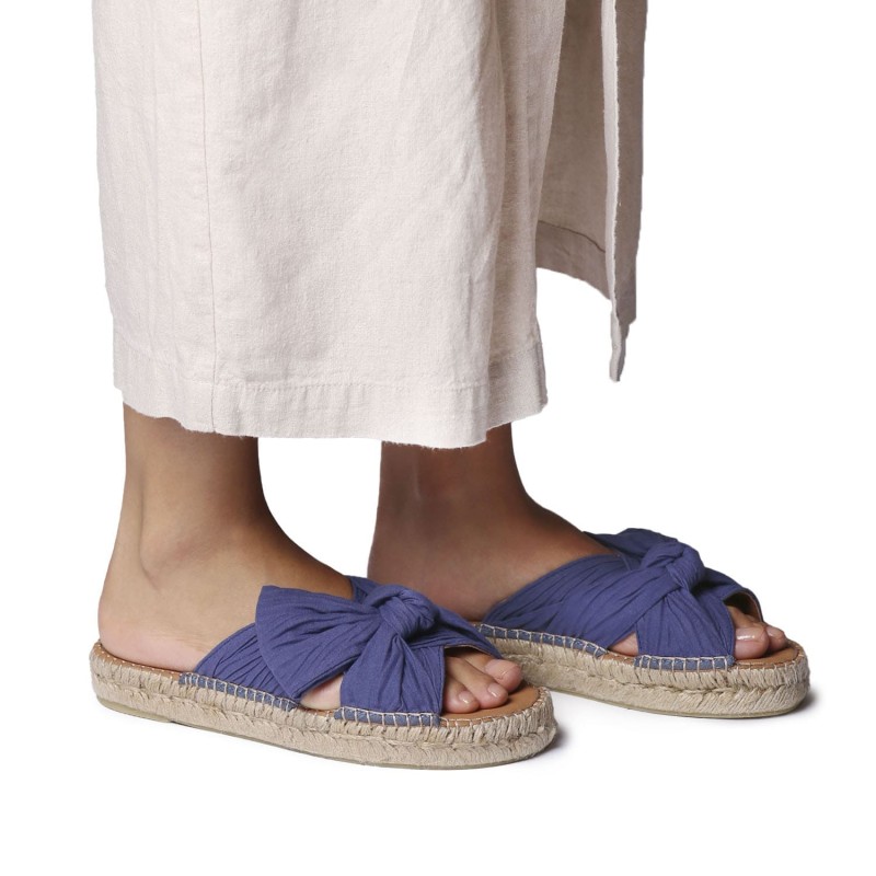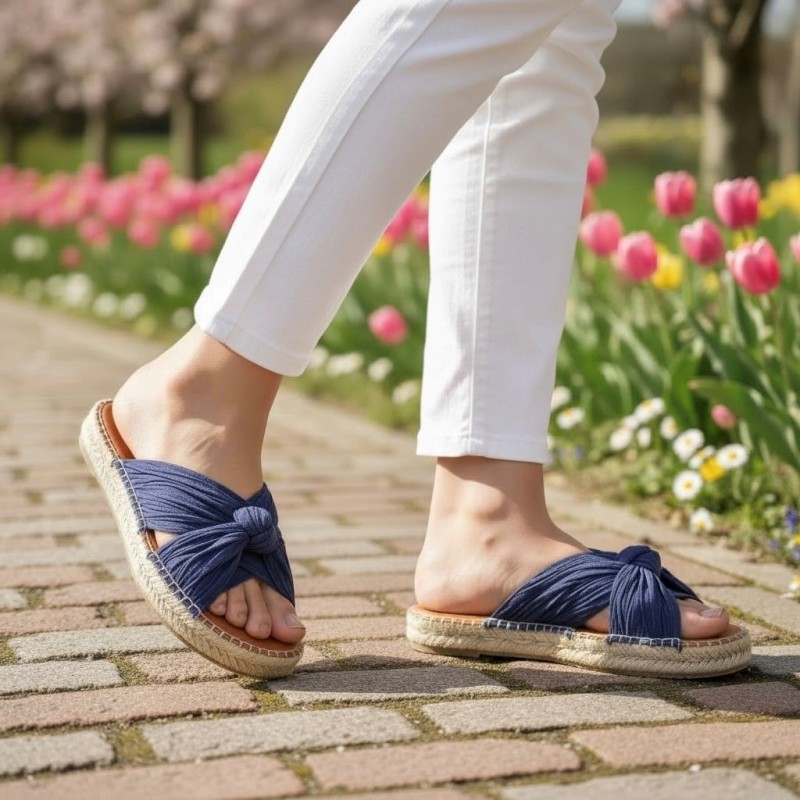 Alpargatas artesanales ELINA tipo zueco para una mujer moderna y que necesita comodidad. Estas sandalias planas para mujer están elaboradas con tejido de una sola pieza y detalle de lazo en la pala. Su diseño combina comodidad y estilo mediterráneo, con una suela de yute trenzado de 1,5 cm y base de goma antideslizante. La plantilla acolchada aporta una pisada suave y confortable. Están cosidas a mano en España. Este modelo calza la talla habitual, si estás entre dos tallas te recomendamos escoger la más pequeña.