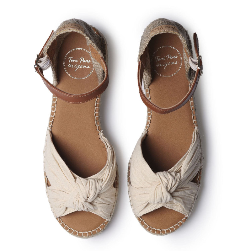 Modelo de alpargatas hechas a mano en La Rioja de la marca propia AnseRioja como antiguamente, con cariño y esmero puntada tras puntada. Modelo que te acompañará este verano sintiéndote estilosa y cómoda. Elaborado con tejido natural ribeteado con estampado cucos. Plantilla acolchada interior para usarla durante horas y plantilla externa en tejido transpirable. Sujeción mediante cintas en la trasera abierta perfectamente confeccionados para adaptarse a ti, atalas al gusto. Cosido a la suela de manera artesanal y pasando por el proceso de moldeado calor-frío. Suela de yute no pesa cuña 4 cuerda media cuña con base ancha. Si tienes el pie ancho te recomendamos avisarnos y podemos moldear con calor para darle un pelín más de anchura. Recomendamos talla habitual tiende a ceder. Combínala con cualquier falda fluida o pantalón veraniego.