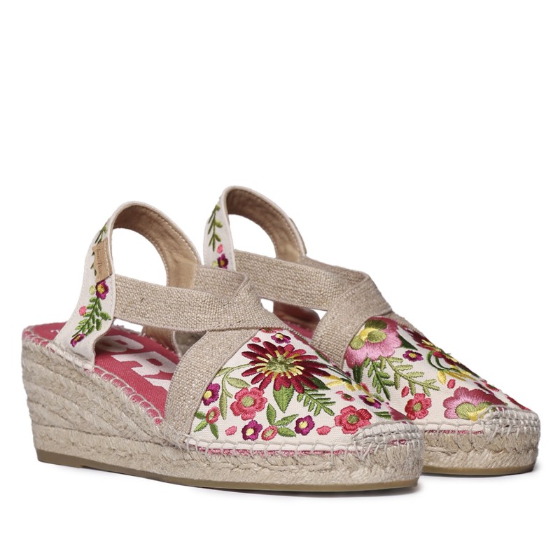 Alpargatas estilosas y artesanales modelo Jessi la alpargata de cuña con cierre de hebilla con un detalle bordado de punto de cruz en la pala. Tiene una altura total de 7 cm, de los cuales 5 cm pertenecen al tacón y 2 cm a la plataforma lo que hace que apenas notes la altura en tus metatarsos. Toda la cuña está hecha de yute y la planta interior está forrada en tejido acolchado. Este diseño está cosido a mano en España. La base de la suela es de goma antideslizante. Este modelo calza la talla habitual, si estás entre dos tallas te recomendamos escoger la más grande. Lo tenemos también en color cruda. Para cualquier look iras monísima.