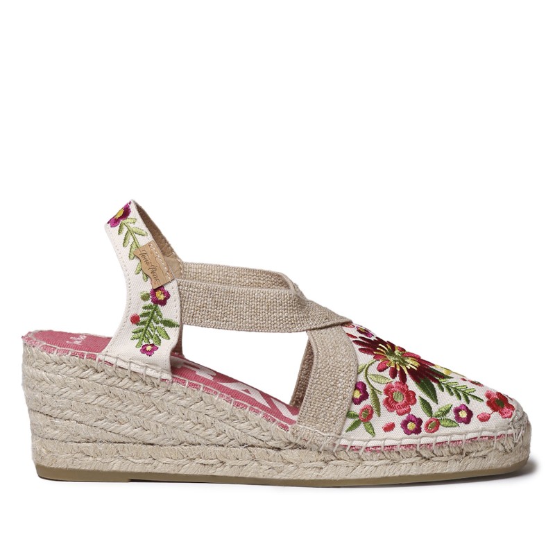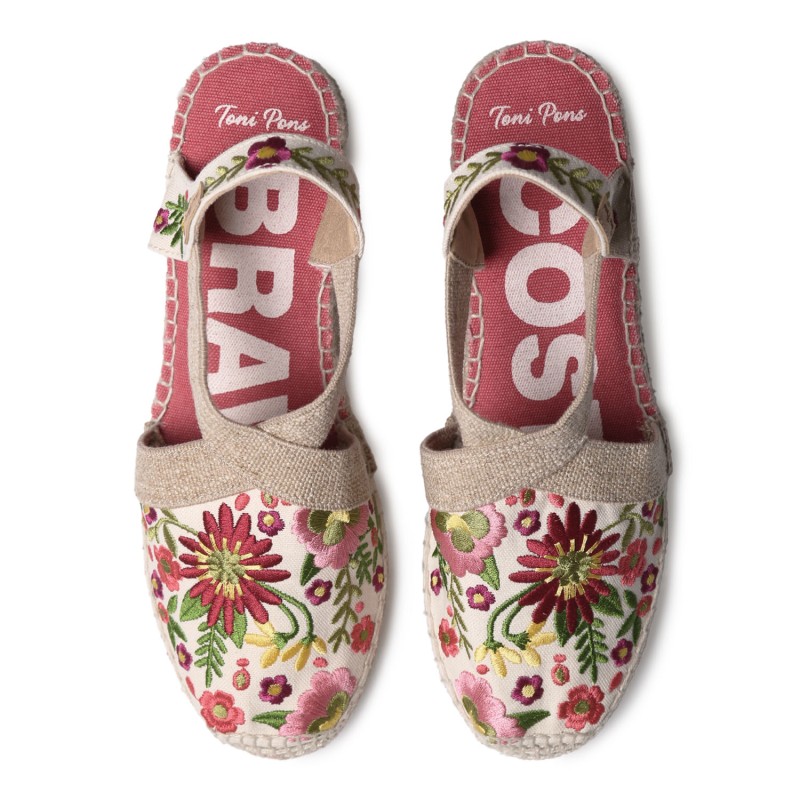 Modelo de alpargatas Eire TR de la marca nacional Toni Pons. Estas alpargatas para mujer están elaboradas con bandas elásticas y serraje con forro de textil transpirable. La cuña de yute tiene una altura total de 3,5 cm. Toda la base de la suela es de goma antideslizante. Este diseño está cosido a mano en España. Se trata de un modelo con el talón y la punta abiertos. Elaborado con dos plantillas lo que la hacen muy cómodas. Este modelo calza la talla habitual, si estás entre dos tallas te recomendamos escoger la más grande.