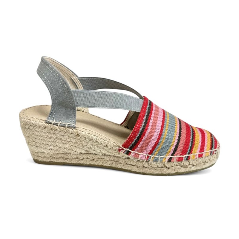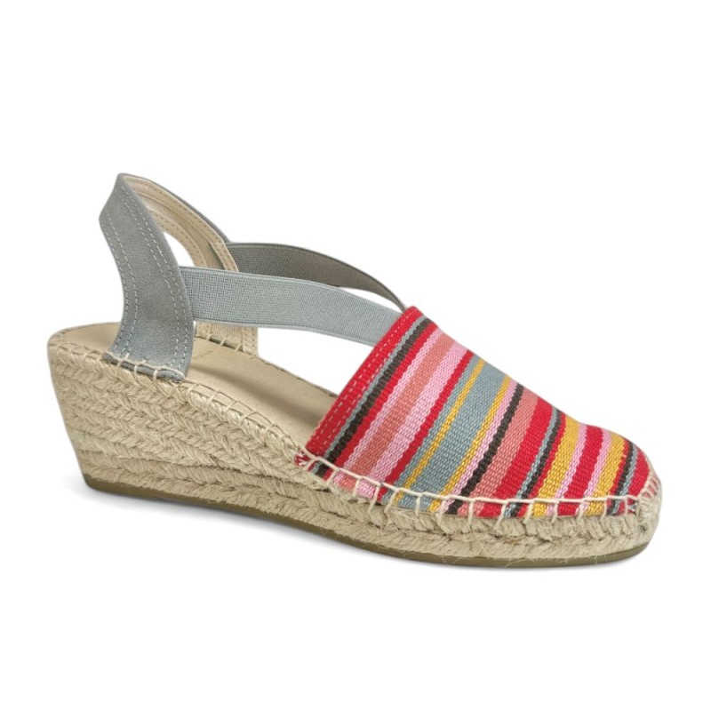 Esta alpargata de mujer modelo Terra está elaborada en tejido multicolor natural. La cuña de yute tiene una altura 4 cuerda, total de 6 cm, de los cuales 4 cm forman parte del tacón y 2 cm de la plataforma, ira muy acolchada y con una muy buena base. La base de la suela es de goma antideslizante y ligera. La plantilla interior está acolchada y forrada en tejido de algodón. Cuenta con dos bandas elásticas para una perfecta fijación al pie. Este diseño está cosido a mano en España. Este modelo calza la talla habitual, si estás entre dos tallas te recomendamos escoger la más grande. Cosido remonte hecho a mano consiguiendo que se adapte mejor a la forma del pie. Tallas del 35 al 41.