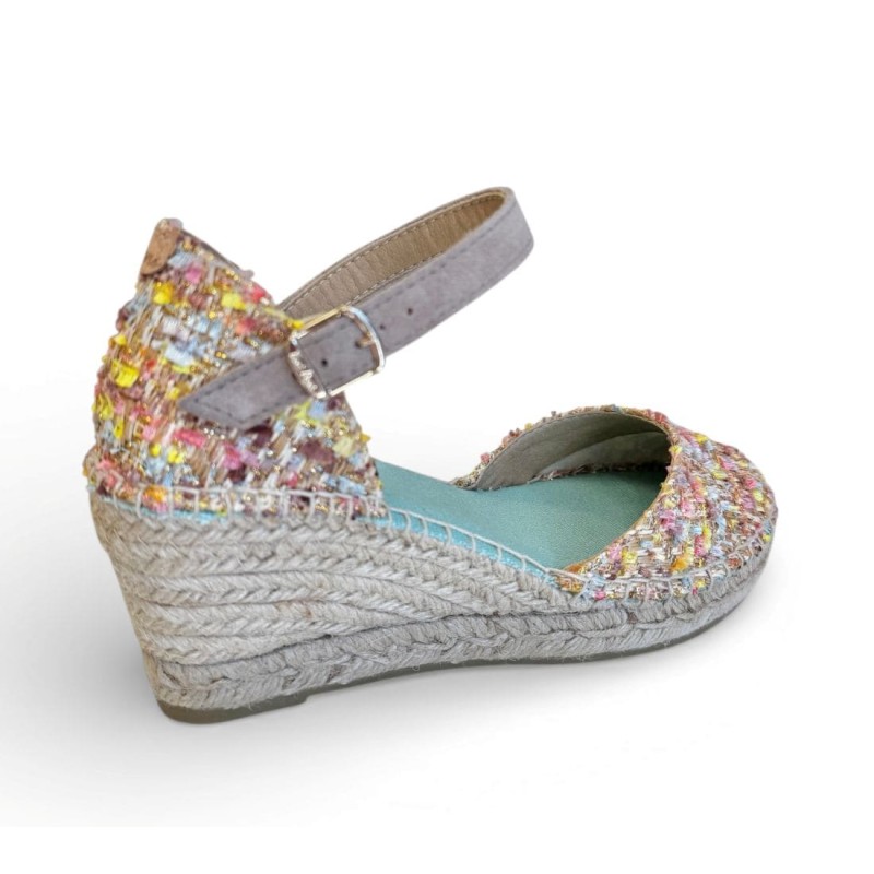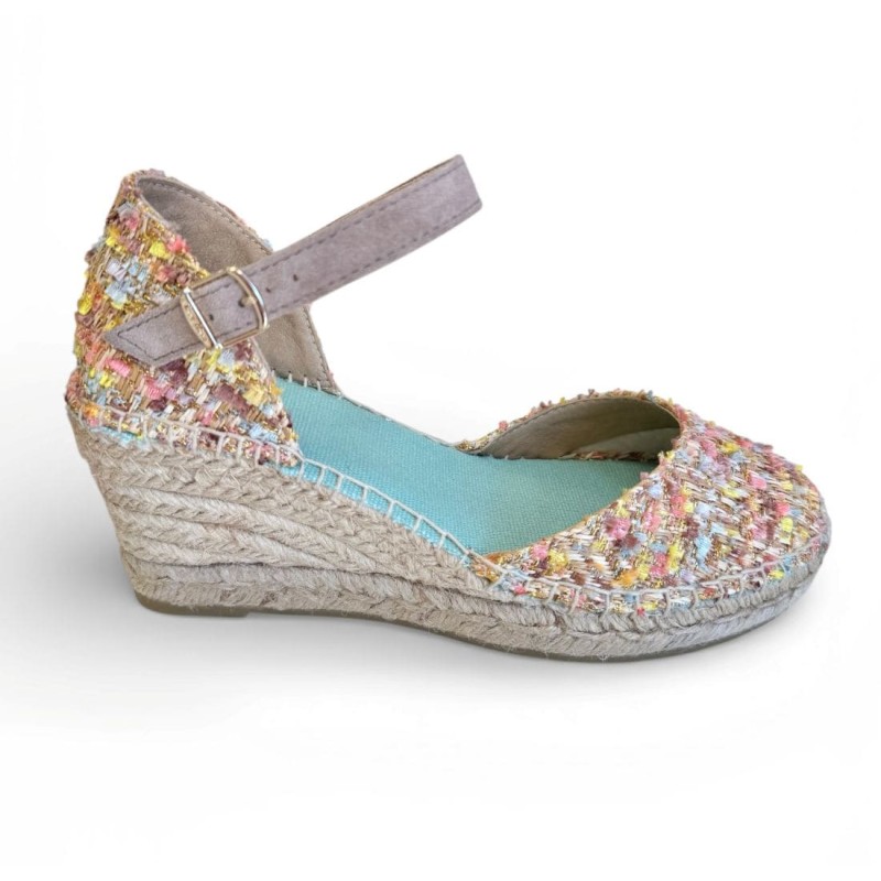 El model TERRA-TT en beige lo puede usar con vestidos mas de vestir o sport. Esta alpargata de mujer está elaborada en tejido multicolor natural. La cuña de yute tiene una altura 4 cuerda, total de 6 cm, de los cuales 4 cm forman parte del tacón y 2 cm de la plataforma, ira muy acolchada y con una muy buena base. La base de la suela es de goma antideslizante y ligera. La plantilla interior está acolchada y forrada en tejido de algodón. Cuenta con dos bandas elásticas para una perfecta fijación al pie. Este diseño está cosido a mano en España. Este modelo calza la talla habitual, si estás entre dos tallas te recomendamos escoger la más grande. Cosido remonte hecho a mano consiguiendo que se adapte mejor a la forma del pie.