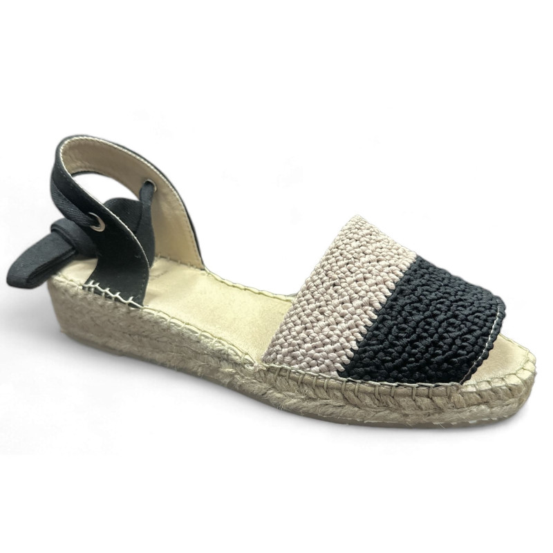 Alpargatas hechas a mano en La Rioja de marca propia como antiguamente, con cariño y esmero puntada tras puntada. Fabricada en tejido natural tipo rafia suave entrelaza los colores el yute y el negro creando rombos. Pala escotada que recoge el pie espectacular. Trasera lino grueso negro con cinta al tono para atar al tobillo. Suela recubierta de yute muy ligera y cómoda cuña 5 cuerdas piso doble en la delantera lo que lo hace mas confortable en su uso para los metatarsos. Plantilla acolchada interna y otra de microfibra transpirable, las notaras muy acolchada. Recomendamos al ponerla abrir su trasera hacia los lados para que la planta del pie se acomode perfecto. El remonte a la suela o cosido se realiza totalmente a mano, pasando por el proceso de forma de la alpargata calor y frio. Si tienes el pie ancho te recomendamos avisarnos y podemos moldearla con calor para darle un pelín mas de anchura. Recomendamos talla habitual. El color es como en la fotografía.