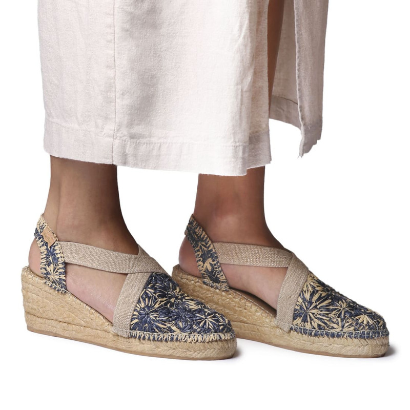 Modelo de alpargatas de alta calidad en rafia multiTERRA-NM. Esta alpargata de mujer está elaborada en rafia multicolor. La cuña de yute tiene una altura total de 6 cm, de los cuales 4 cm forman parte del tacón y 2 cm de la plataforma. La plantilla interior está acolchada para mayor comodidad y la base de la suela es de goma antideslizante. Cuenta con dos bandas elásticas para una perfecta fijación al pie. Este diseño está cosido a mano en España. Este modelo calza la talla habitual, si estás entre dos tallas te recomendamos escoger la más grande.