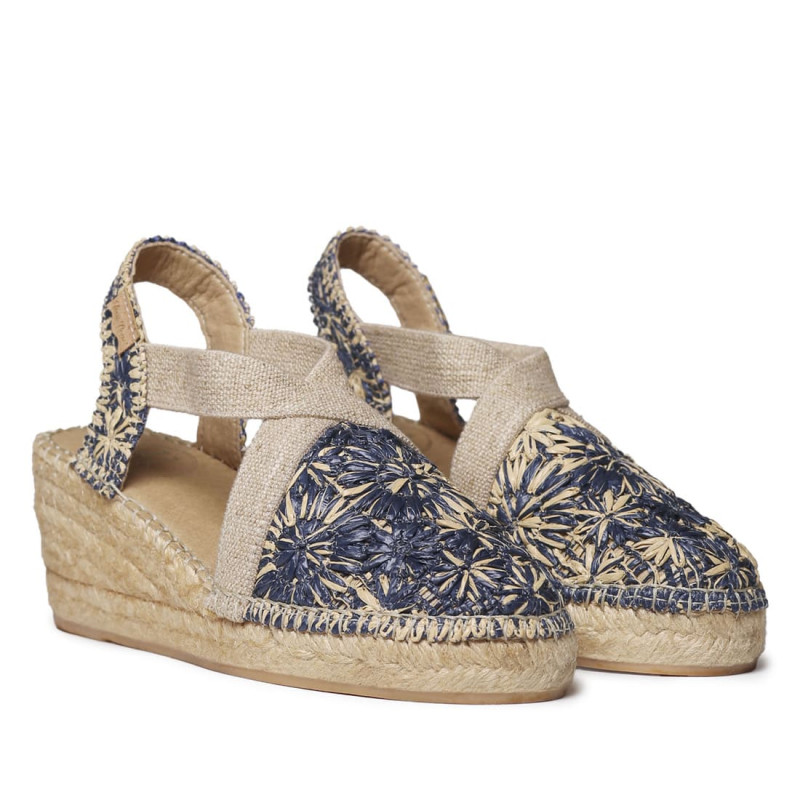 Modelo de alpargatas hechas a mano en La Rioja de la marca propia AnseRioja como antiguamente, con cariño y esmero puntada tras puntada. Modelo que te acompañará este verano sintiéndote estilosa y cómoda. Elaborado con tejido piqué transpirable, cenefa beige con detalles de colores. Plantilla acolchada interior para usarla durante horas y plantilla externa en tejido transpirable. Sujeción mediante dos elásticos perfectamente confeccionados para adaptarse a ti. Cosido a la suela de manera artesanal y pasando por el proceso de moldeado calor-frío. Suela de yute no pesa cuña 4 cuerda media cuña con base ancha. Si tienes el pie ancho te recomendamos avisarnos y podemos moldear con calor para darle un pelín más de anchura. Recomendamos talla habitual tiende a ceder. Combínala con cualquier falda fluida o pantalón veraniego.