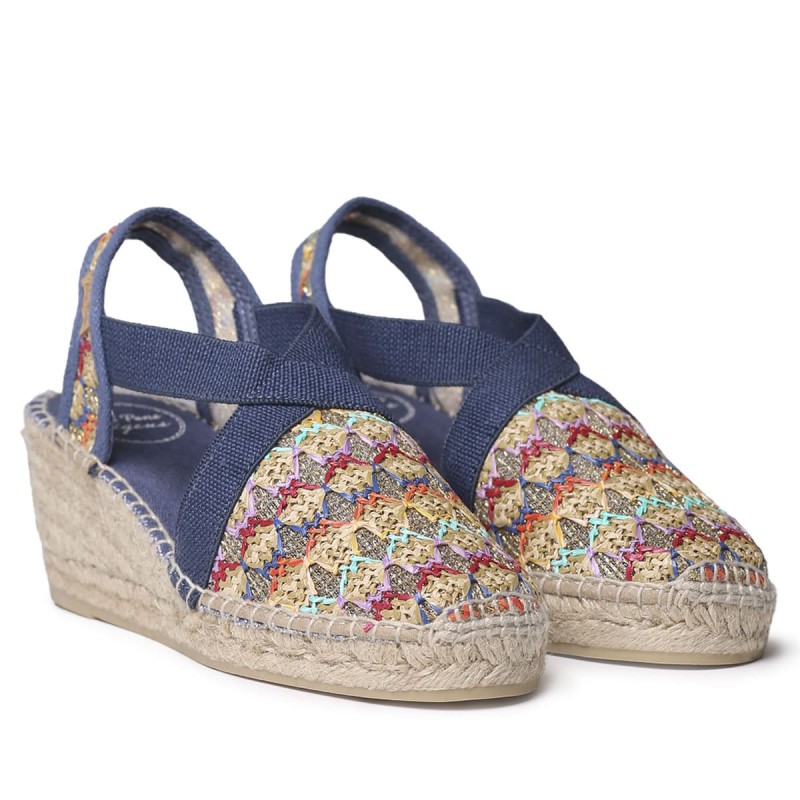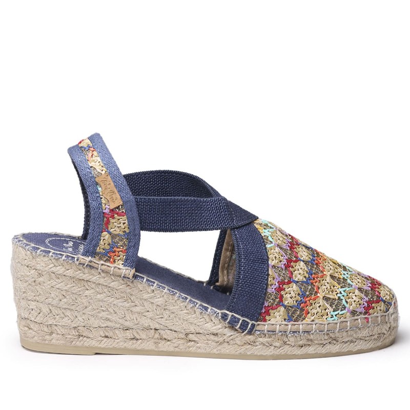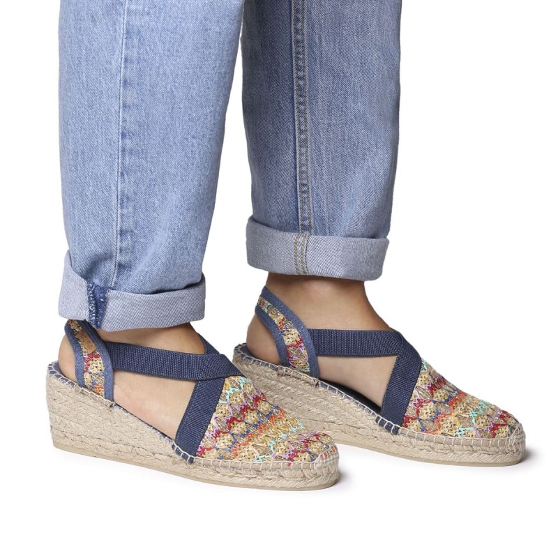 Alpargata preciosa de mujer Masái cuenta con dos grandes tiras cruzadas elásticas multicolor. Se trata de un diseño abierto con una cuña de yute de 6,5 cm con plataforma delantera de 4 cm lo que hace que los metatarsos no sufran y el pie este acolchado. La plantilla interior de piel está acolchada para una mayor comodidad, la base de la suela es de goma antideslizante y es ligera. La trasera esta confeccionada con piel nobuk muy suave dándole distinción. Este diseño está cosido a mano en España. Este modelo calza la talla habitual, si estás entre dos tallas te recomendamos escoger la más grande. Recomendamos ajustarla manualmente ya que su remonte o cosido de puede adaptar a mano. Recoge muy bien. También en color crudo.