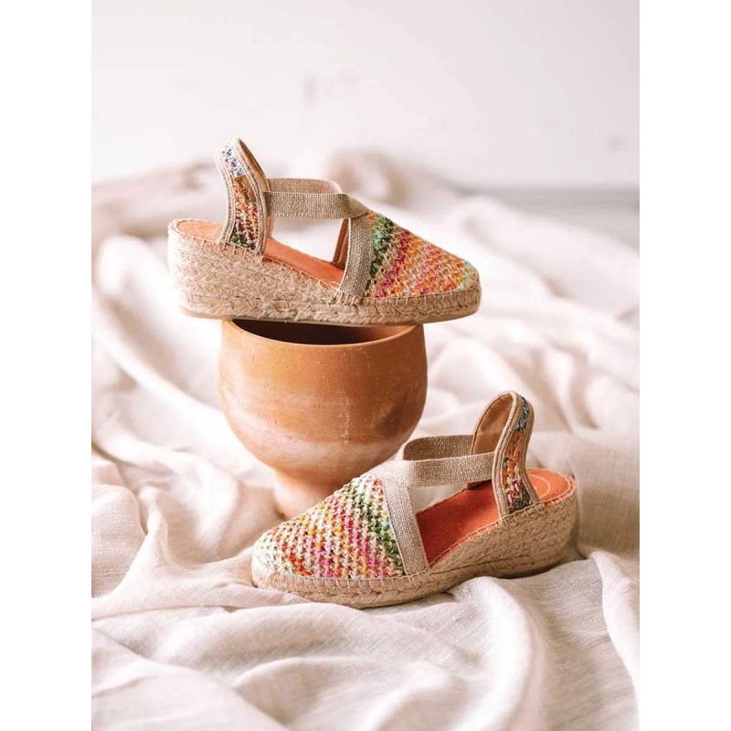 Modelo de alpargatas Eire TR de la marca nacional Toni Pons. Estas alpargatas para mujer están elaboradas con bandas elásticas y serraje con forro de textil transpirable. La cuña de yute tiene una altura total de 3,5 cm. Toda la base de la suela es de goma antideslizante. Este diseño está cosido a mano en España. Se trata de un modelo con el talón y la punta abiertos. Elaborado con dos plantillas lo que la hacen muy cómodas. Este modelo calza la talla habitual, si estás entre dos tallas te recomendamos escoger la más grande.
