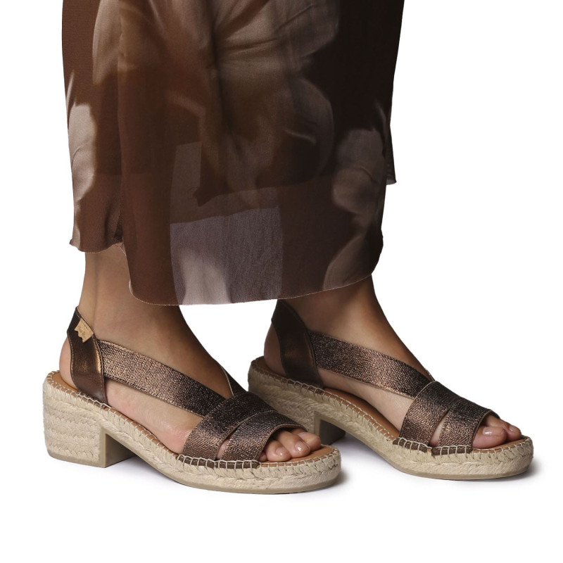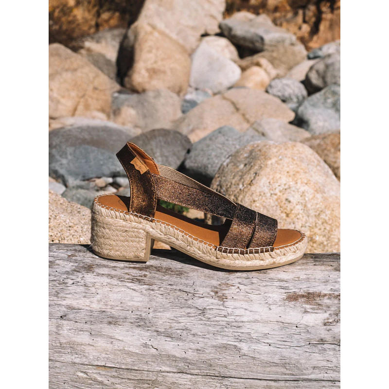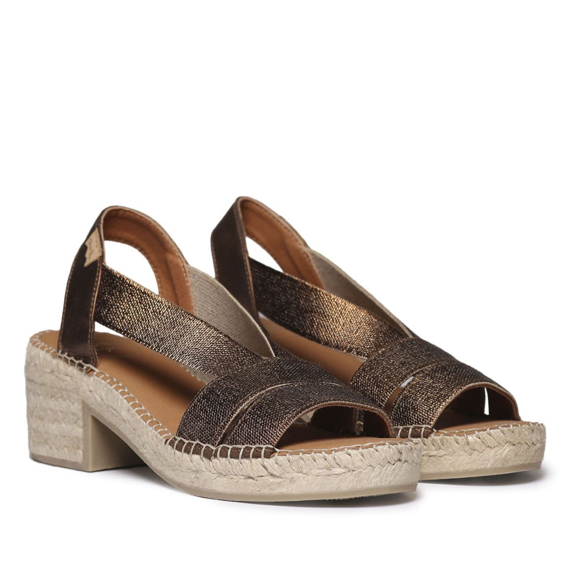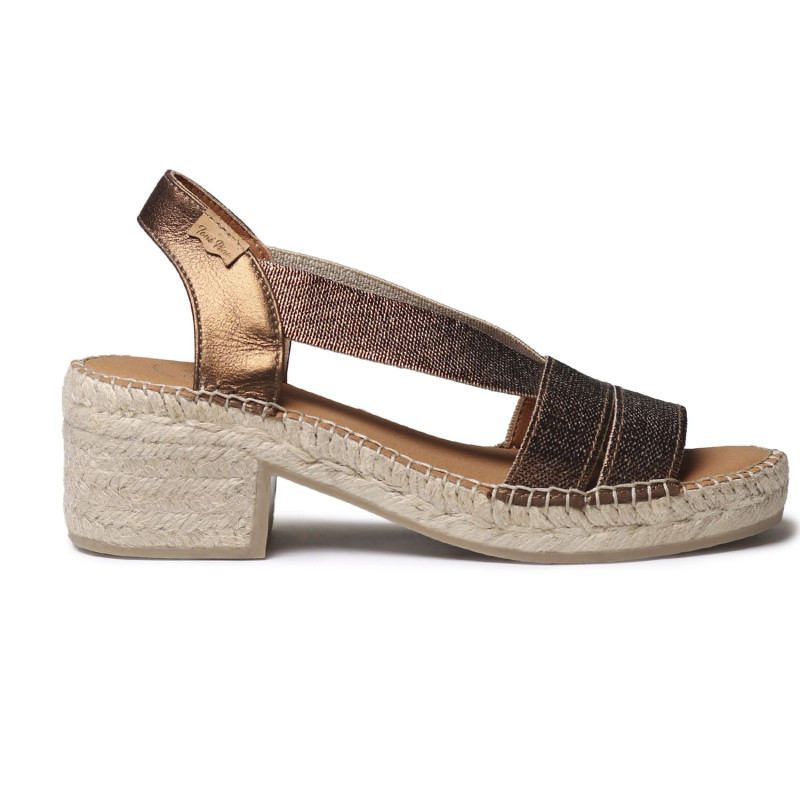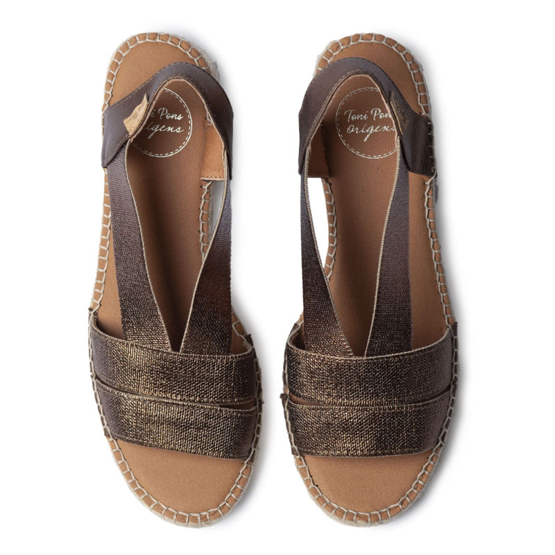 Alpargatas originales y elegantes Doris en oro. Esta alpargata de Toni Pons para mujer con tacón bajo combina artesanía y estilo contemporáneo. Está elaborada en tejido trenzado metalizado, que aporta un brillo sutil. Su diseño presenta tiras cruzadas en la parte delantera y una pulsera elástica trasera, que ofrece un ajuste cómodo y práctico. El tacón ancho en yute, junto con la plantilla acolchada, garantizan confort y estabilidad en cada paso. Este diseño está cosido a mano en España y tiene una altura total de 4 cm. Este modelo calza la talla habitual, si estás entre dos tallas te recomendamos escoger la más grande.