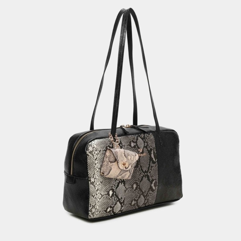 Este modelo de bolso bandolera elegante es Levy disponible en confeccionado en material sintético efecto serpiente Tiene 2 posciones: hombro y bandolera, además de llevar un charm en la parte delantera. En su interior dispone de diversos compartimentos diferentes, a los cuales se accede mediante una cremallera. Los detalles metálicos son de color oro claro. Se siente un bolso ligero y muy agradable al tacto.