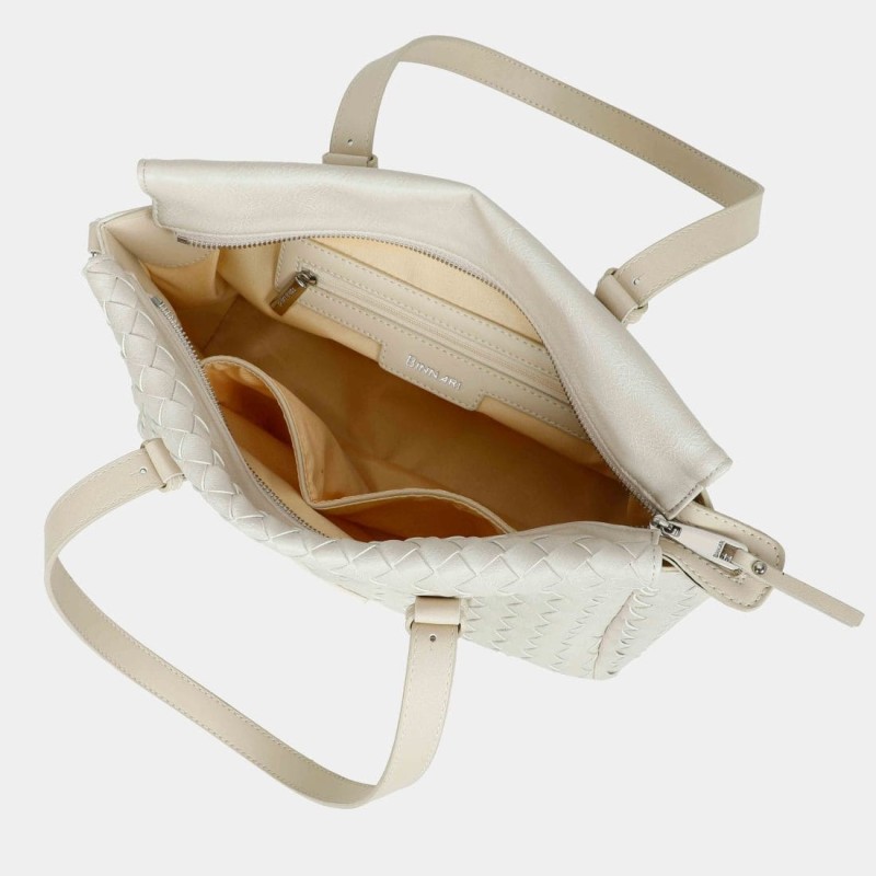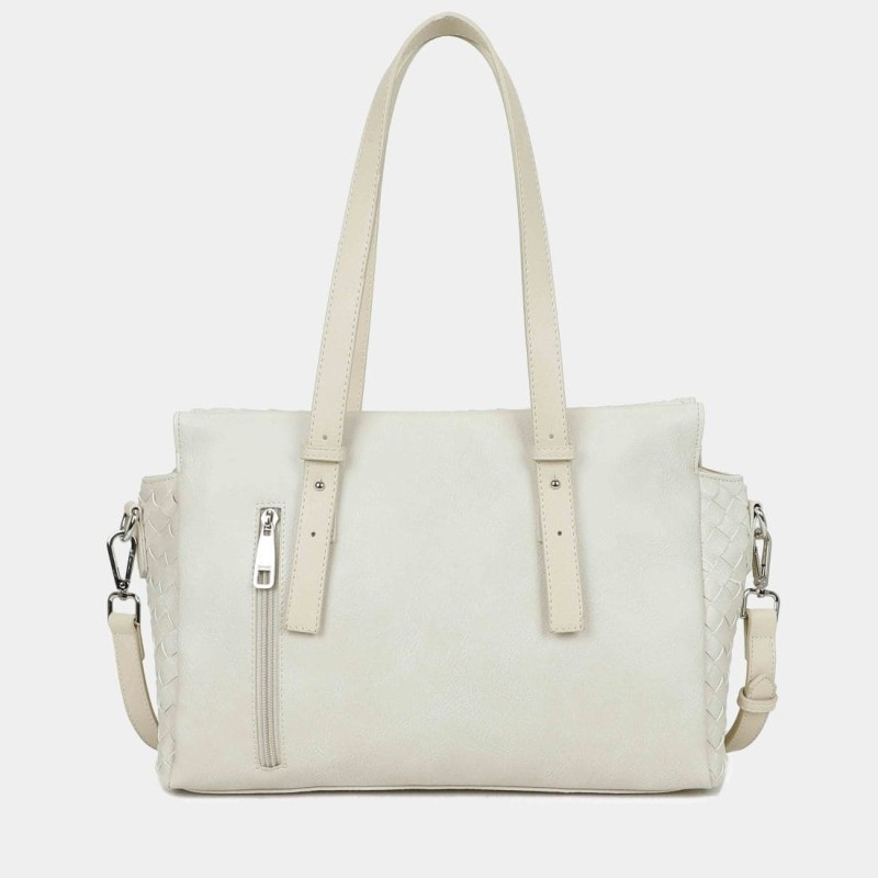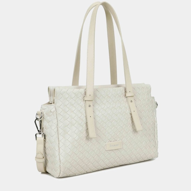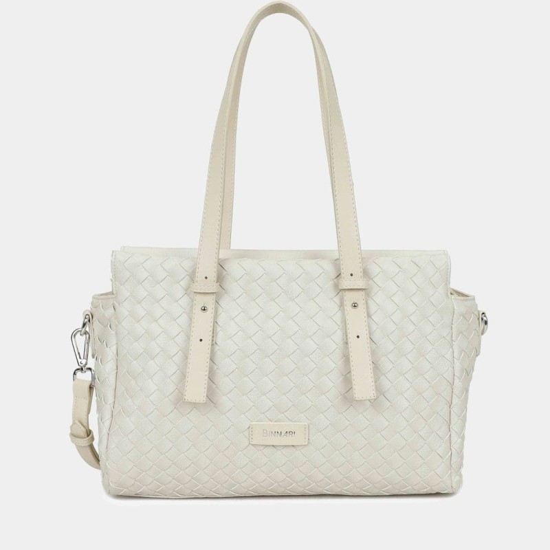 Detalles de Bolso dos asas Turia Bolso dos asas Turia. 20660 Confeccionado en pu trenzado de alta calidad 2 posiones: hombro y bandolera Asa ajustable Exterior: chapón logo Binnari y 1 bolsillos con cremallera en parte trasera Interior: 2 bolsillos, uno de ellos con cremallera Detalles metálicos en nickel