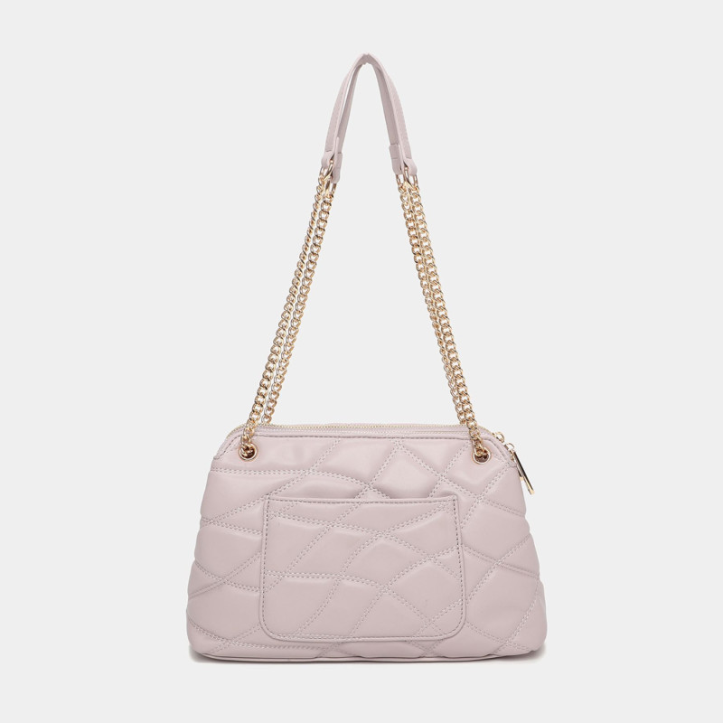 Bolso de hombro grande Ella confeccionado en pu alcolchado de alta calidad. Sus asas son mitad de polipiel y mitad de eslabones metálicos de color oro viejo. Tiene detalles fruncidos en el lateral así como bolsillos con cremalleras para aportar más seguridad. ¿Te vas a quedar sin él?Alto: 32 cm Ancho: 38cm Fondo: 6cm