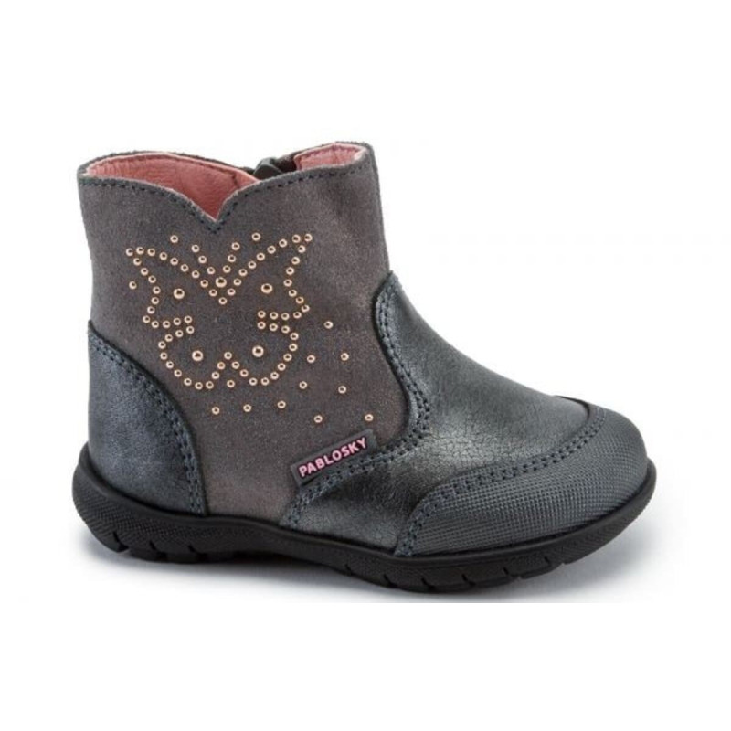 Botín Hilton Cristal de PABLOSKY. Una monada de botita en color plomo con adorno en tachas y pelito caliente para nuestras pequeñas brujillas. La lengüeta tiene unas rayas muy chulas. Sistema de cierre mediante cordón y cremallera parea facilitar la puesta. Fabricada en los mejores materiales. Ideal para cualquier look moderno. Calce normal. HECHO EN ESPAÑA. Tallas desde el 21.