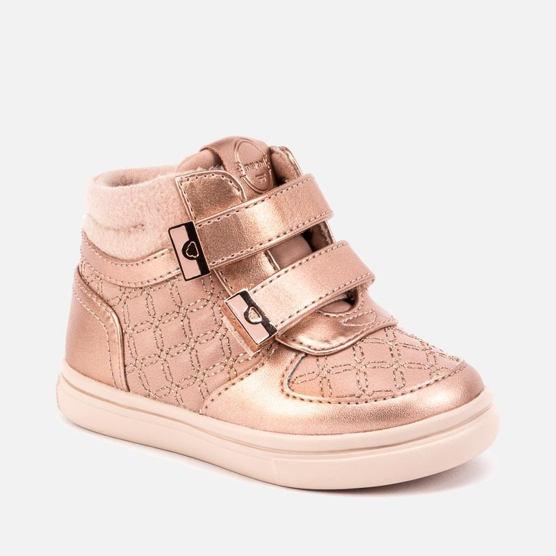 Modernos botines deportivos para bebé niña, ideales para dar un toque casual a su look. Calzado con forro interior de algodón y plantilla de piel. Revestimiento exterior combinado de piel y materiales a contraste. Cierre regulable con doble velcro para una puesta rápida y un mejor ajuste. Puntera con refuerzo de piel para mejorar la resistencia y durabilidad del calzado. Elementos de adorno: decoraciones libres de químicos. Artículo con piezas de piel libres de cromo.