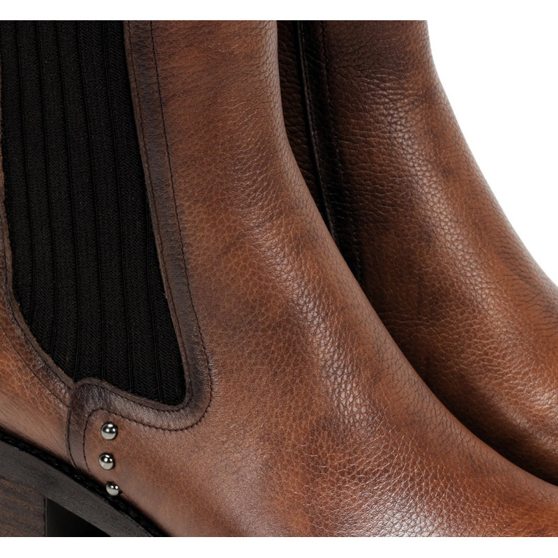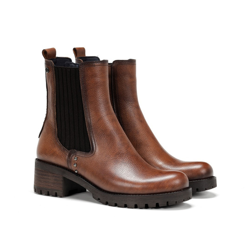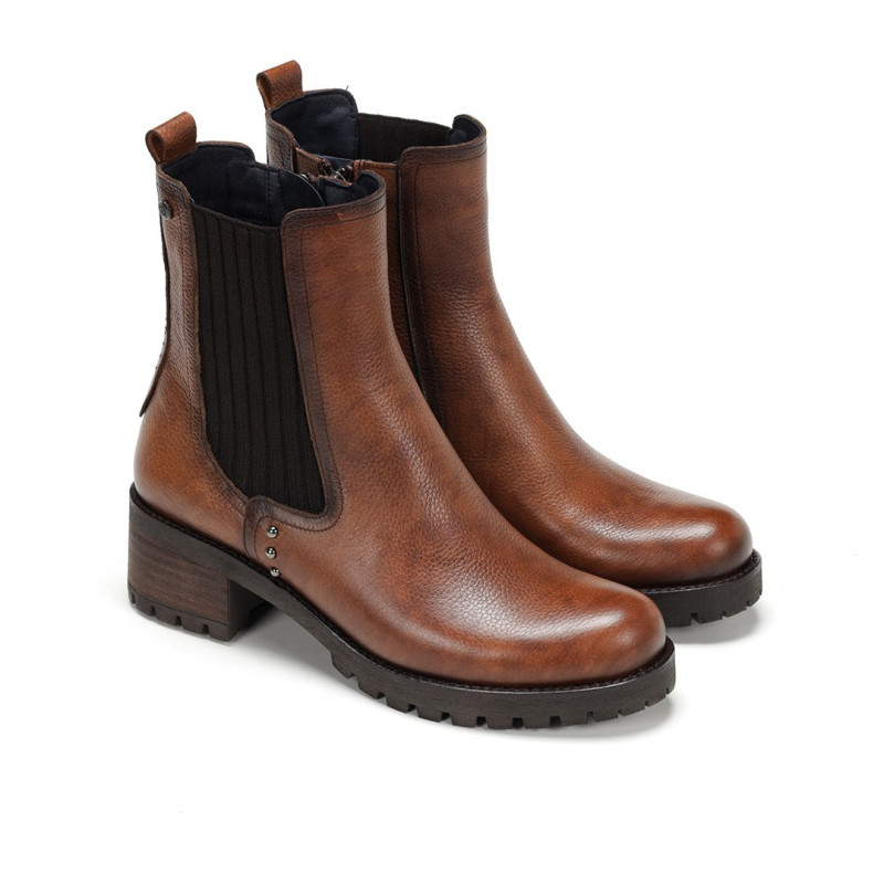 Botín para mujer fabricado en piel vacuno de la marca Fluchos. Modelo muy ligero y comodísimo. Fabricada en piel napa color cuero con forro térmico en su interior. Cremallera interior y electicos en el empeine. Calce normal. Hecho en España. Una maravilla para todo el invierno.