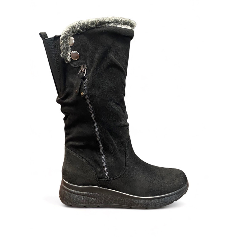 Botín de caña media muy cómoda de la marca Mysoft, ligera fabricada en textil con tratamiento water repellent en color Negro de la marca Mysoft. Bonito detalle de cremallera lateral y botones. Interior en textil con ribete decorativo de pelito color gris. Plantilla extraíble Memoryfoam para amortiguar y suavizar la pisada. Muy ligera y flexible. No pesa nada. Cierre mediante cremallera lateral para mayor facilidad en el calce y elásticos en la parte alta de la caña. Realizado con botellas de plástico recicladas. Elegir talla habitual normalmente.