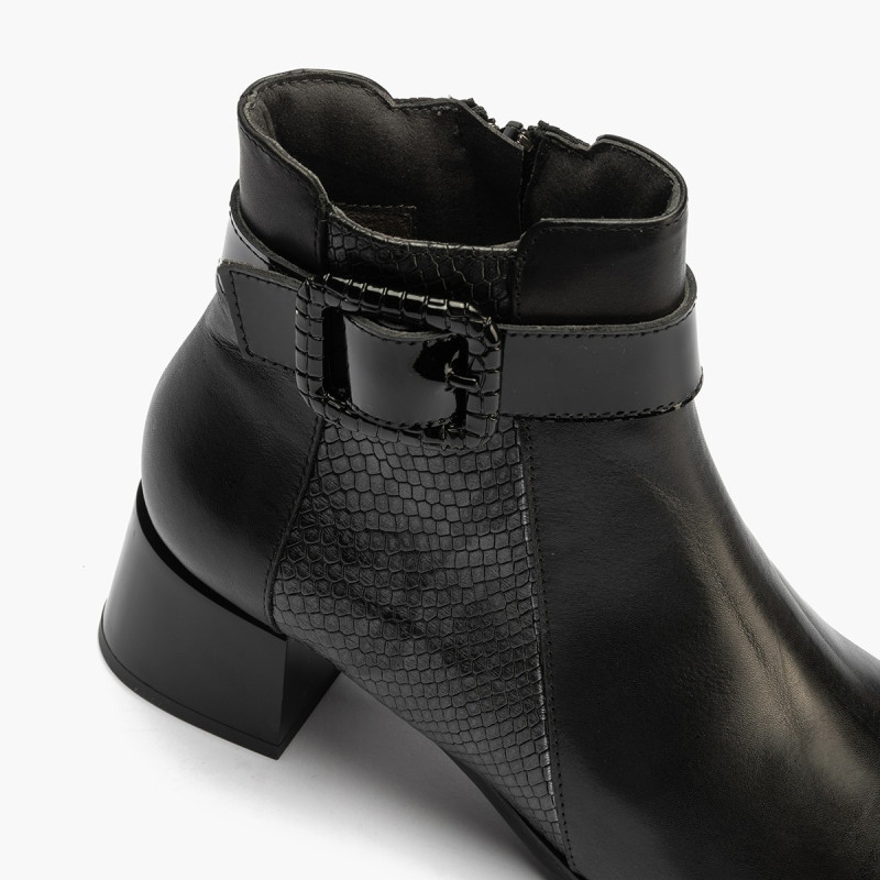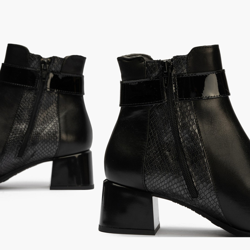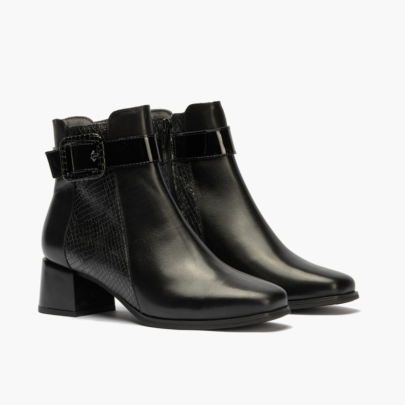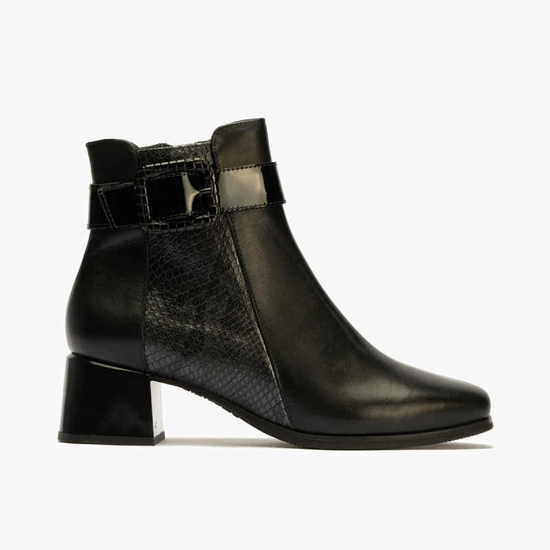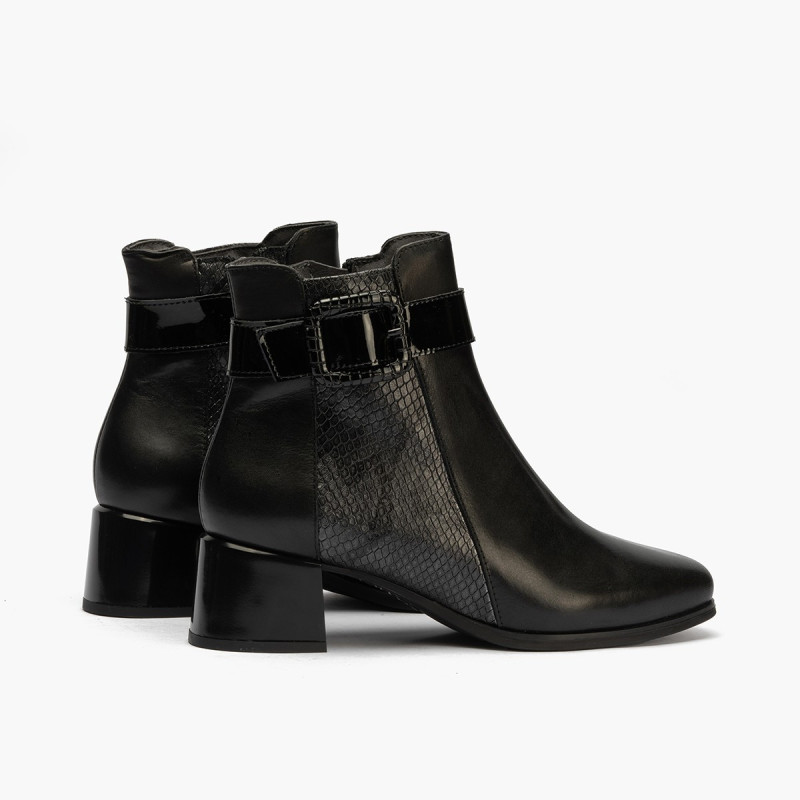 Botín de vestir en piel color negro y burdeos con tacón cuadrado Pitillos para mujer. Características: Cierre con cremallera, tacón 5 cm, suela de goma, exterior piel napa y trasera charol coco, forro interior textil transpirable y plantilla extraíble. Térmico y súper absorbente: forros y plantillas transpirables que absorben el sudor combatiendo la aparición de olores. Además de proporcionarle una agradable sensación de confort y bienestar. Calce normal. Hecho en España.