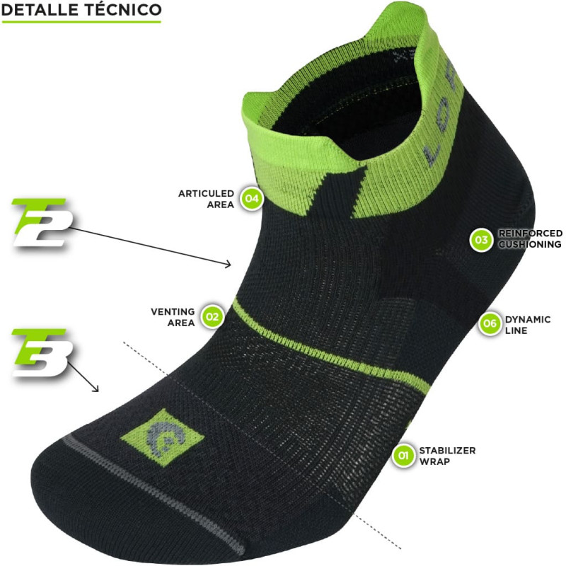 T3. Tecnología exclusiva de tres capas de hilo diferenciadas, que permite obtener el máximo rendimiento de cada tipo de hilo para un máximo beneficio para el pie del deportista.
