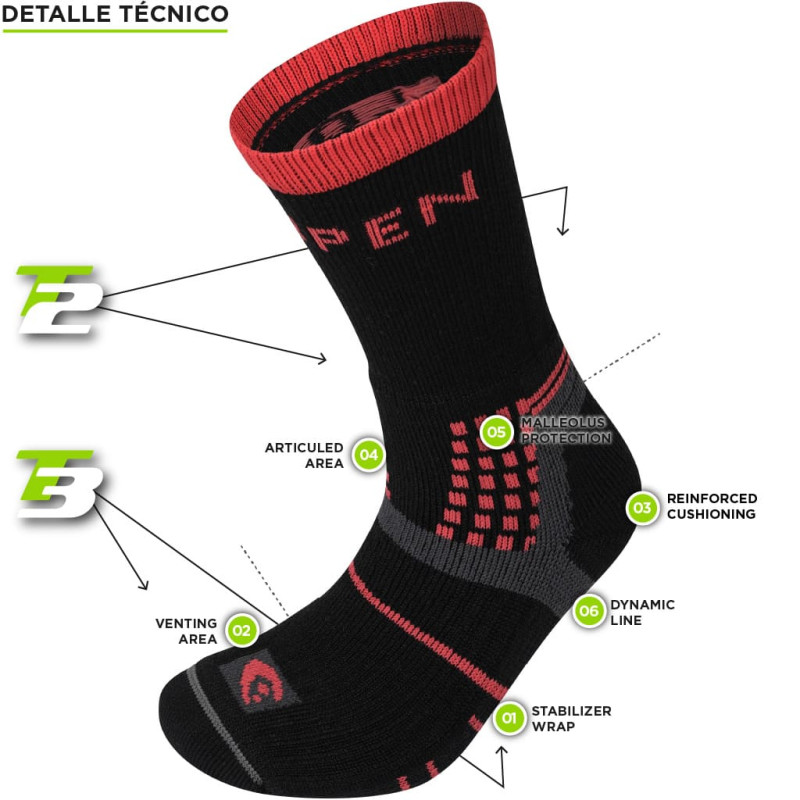 Versión femenina del T3 supergrueso y reforzado. Pie seco y caliente en las condiciones más extremas. Ideal para las rutas con bota rígida o semirrígida, ahora con puño confort plus, que no aprieta ni deja marca. Pies secos, materiales que retienen el calor no dejando que los pies queden fríos, material antiampollas. Áreas 01 zona de ajuste, 02 ventilación, 03 área protección reforzada, 04 área articulada, 05 protección de maléolos. Perfecta para temporada de otoño invierno.