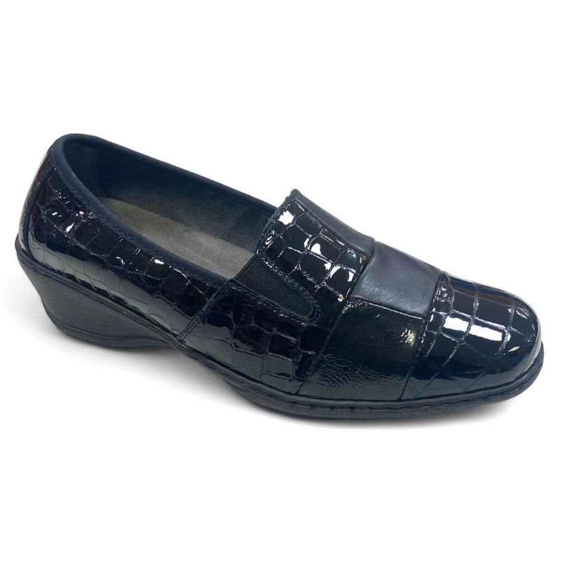Zapato para pie delicado que necesita alta capacidad en dedos y empeine. Marca nacional Doctor Cutillas. Fabricado en tejidos técnicos charol y licras estampadas muy suaves. Suela muy ligera y cómoda con una pequeña cuña. Plantilla extraíble acolchada con posibilidad de poner ortopédica. Aconsejamos medir su plantilla y ponerse en contacto con nosotros y le ayudaremos. El calce del zapato es grande, calza mas o menos una talla mas que en un calzado normal, si tiene dudas le damos las medidas del calzado. Sistema de cierre con velcro de alta capacidad.