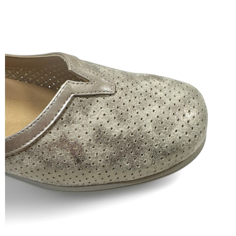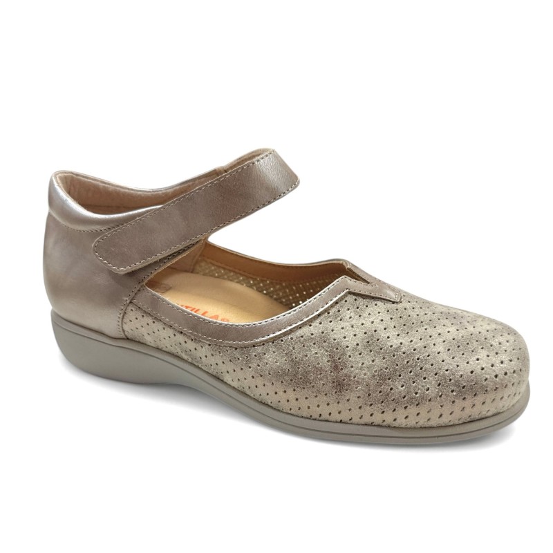 Zapato estilo Mercedes para primavera verano de la marca Riojana Pitillos. Confeccionado en piel fantasía muy bonita con un fino brillo oro y picados. Sistema de velcro para ajustarlo bien al empeine. Forro técnico textil que aporta extra-confort y sensación térmica óptima, perfecto para Primavera Verano. Plantillas extraíbles antibacterianas. Suela muy ligera y cómoda de 2 cm. Normalmente damos la talla habitual. Si tienen dudas nos pueden consultar.