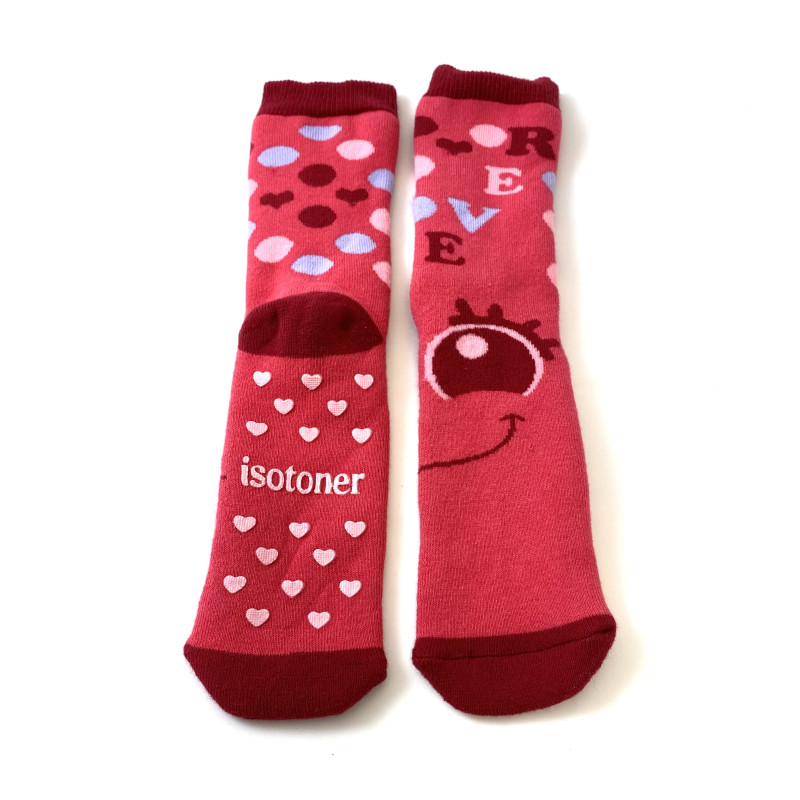 Estos calcetines de forma alta están hechos de algodón 90 %, Nylon 9%, 1% licra, una tela muy suave y cómoda de llevar. Se puede lavar en la lavadora programas cortos. Tienen tacos de goma en la suela para que no resbalen, lo que garantiza toda la seguridad necesaria para tu peque. Por último, estos calcetines están decorados con un motivo de carita sonriente que sin duda le encantará a tus hijas.