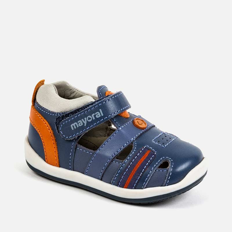 Zapato city en piel de bebe MAYORAL. Sujeción adicional mediante velcro, en color camel y en marino. Plantilla extraíble con marca para saber si le queda bien al peque. Suela flexible para poder gatear y con absorbe impacto. Calce amplio de talla. Si tiene el empeine muy gordito comprar talla grandecita.