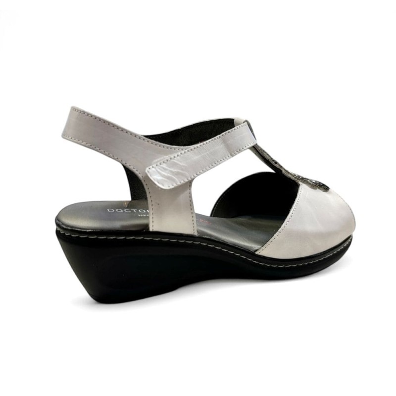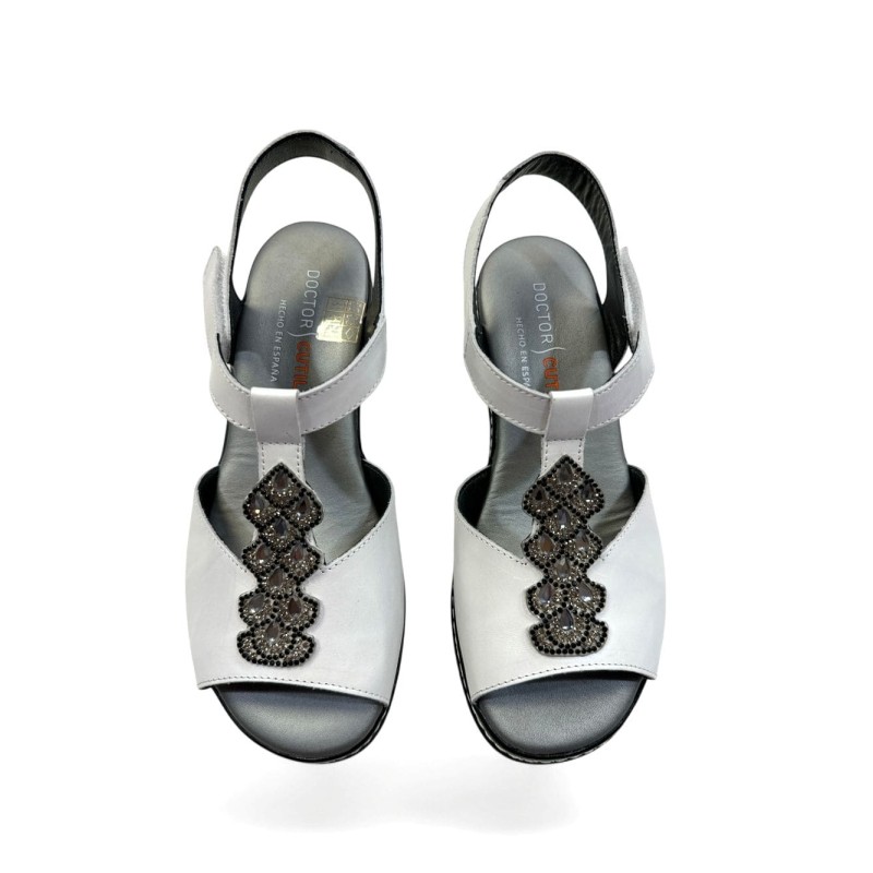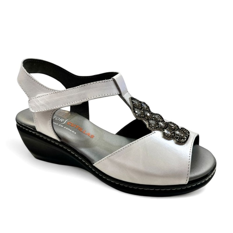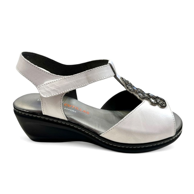 Una de las sandalias de nueva temporada, vestidas mas cómodas y ancho especial de Doctor Cutillas, nos presenta esta elegante sandalia de señora, con cuña media. Acabado en piel metalizada, con detalle de piedras brillantes sobre la pala, una pala con una forma que recoge muy bien. Además lleva una plantilla acolchada, que aporta mayor comodidad al andar y dispone de cierre de pulsera. Su calce es amplio comprar talla habitual de este tipo de calzado nunca mas grande ya que tiende a ser amplia. Disponemos de dos colores para elegir. Una sandalia que recoge muy bien juanetes. Fabricado en España. Envíos 24-48 horas.