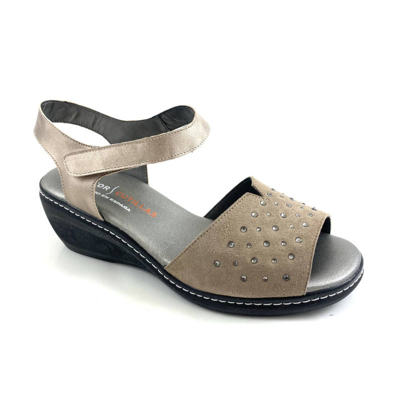 Una de las sandalias de nueva temporada, vestidas mas cómodas y ancho especial de Doctor Cutillas, nos presenta esta elegante sandalia de señora, con cuña media. Acabado en piel metalizada, con detalle de piedras brillantes sobre la pala, una pala con una forma que recoge muy bien. Además lleva una plantilla acolchada, que aporta mayor comodidad al andar y dispone de cierre de pulsera. Su calce es amplio comprar talla habitual de este tipo de calzado nunca mas grande ya que tiende a ser amplia. Disponemos de dos colores para elegir. Una sandalia que recoge muy bien juanetes. Fabricado en España. Envíos 24-48 horas.