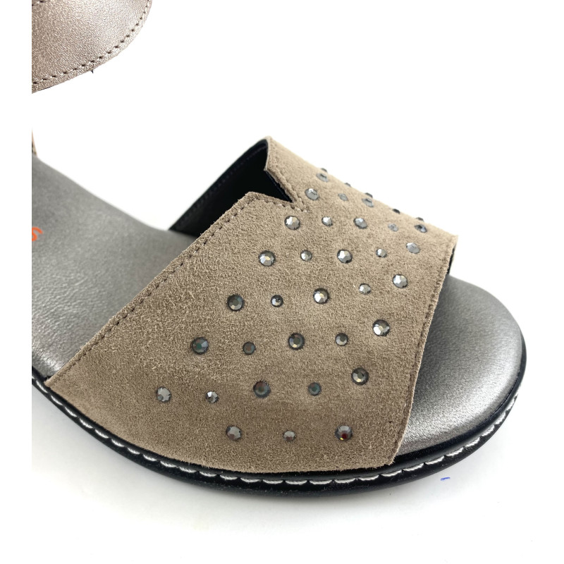 Sandalia de la marca Riojana Pitillos. Para pie delicado y de horma un poco ancha, la pala sujeta muy bien la anchura del pie incluso con juanete. Fabricada en piel espigada en color plata y negro suave. Tejido transpirable en su interior, plantilla gordita acolchada y extraíble para una mayor comodidad. Con ella vestirás a la vez que iras muy cómoda. Suela con un poco de plataforma y pequeña cuña baja. Calce normal-amplio. Hecho en España.