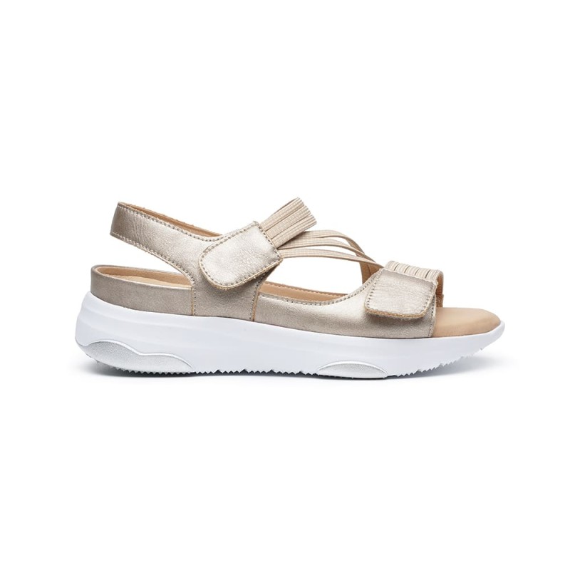 Ideales sandalias en tres tonos con tiras tubulares muy suaves para cuidar de nuestro pie. Fabricadas en pieles metálicas y napa. Suela antideslizante con plataforma muy ligera y cómoda. Sistema de cierre comodisimo con velcro. Calce normal.