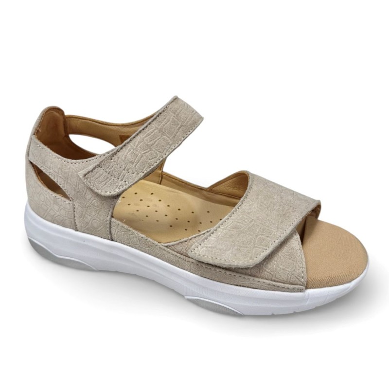 Sandalia cómoda de velcro de la marca Riojana Pitillos. Para pie delicado y de horma un poco ancha, con tres puntos de ajuste, pala velcro delantera y pala velcro en el empeine para adaptarla perfectamente, la pala sujeta muy bien la anchura del pie incluso con juanete, trasera con ajuste hebilla ya que al andar hacemos fuerza con el talón y esta sujeta mas. Fabricada en piel espigada en color beige y marino. Tejido transpirable en su interior, plantilla gordita acolchada y extraíble para una mayor comodidad. Con ella vestirás a la vez que iras muy cómoda. Suela con un poco de plataforma y pequeña cuña baja. Calce normal-amplio. Hecho en España.