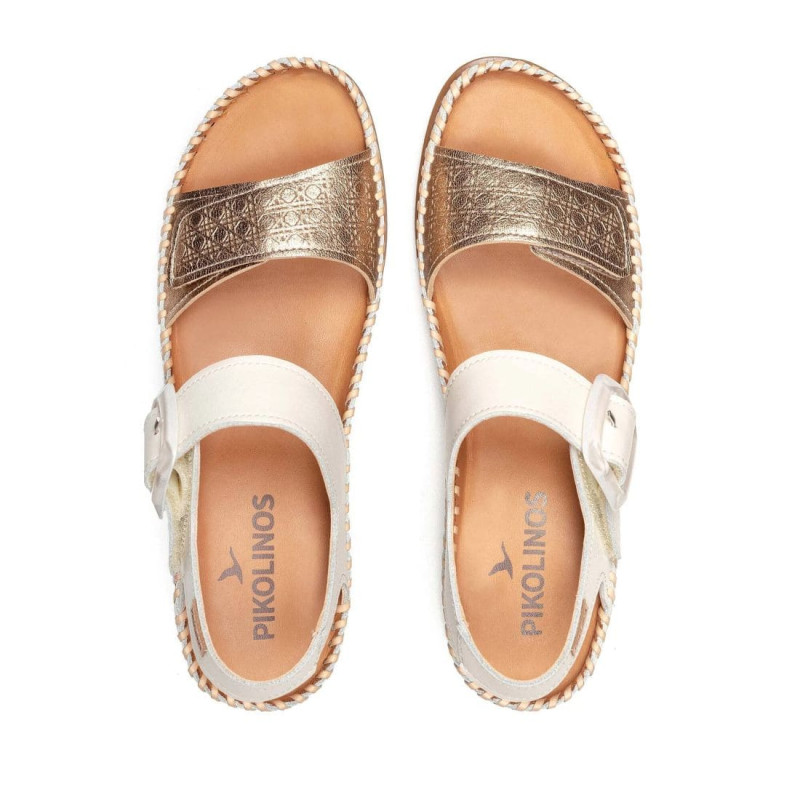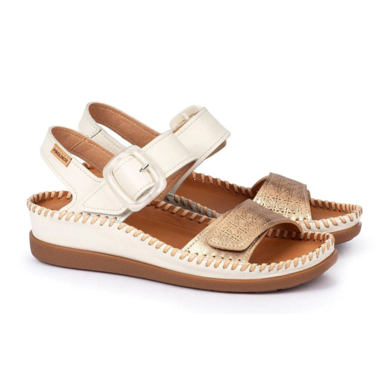 Sandalias de vestir para mujer moderna Pitillos. Cuña ligera y cómoda con plataforma delantera para evitar dolores en el metatarso. Planta acolchada. Corte precioso con calados en dorado. Sistema de hebilla para ajustar a ala medida. Calce de talla normal, recoge muy bien el pie.