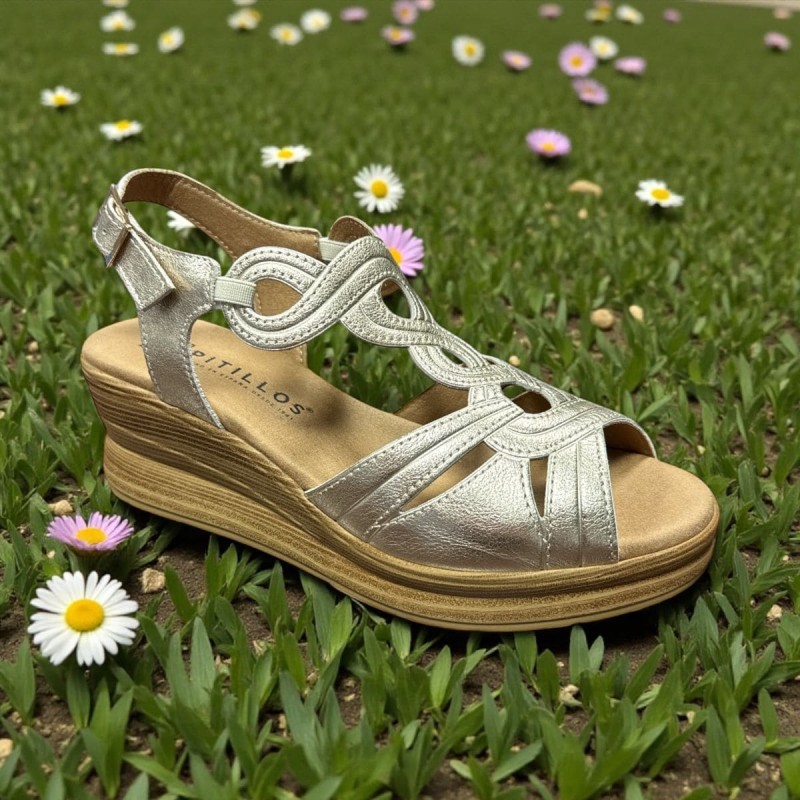 Sandalia para mujer con cuña plataforma de la marca riojana Pitillos. Pala fabricada en piel napa lisa y grabada con vivo en metal espectacular, forradas de tejido para que no rocen. Talonera abierta con ajuste velcro tipo pulsera. Plantilla de un centímetro de grosor lo que la hace mucho mas cómoda en el día a día, no extraíble. La suela es antideslizante y con un grosor plantar estupendo para no notar el suelo, cuña muy ligera con plataforma. Sienta muy bien en diferentes tipos de pie. Calce amplio talla habitual. Si quieres ir arreglada pero cómoda esta es tu sandalia este verano.