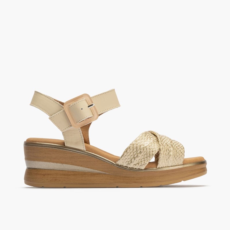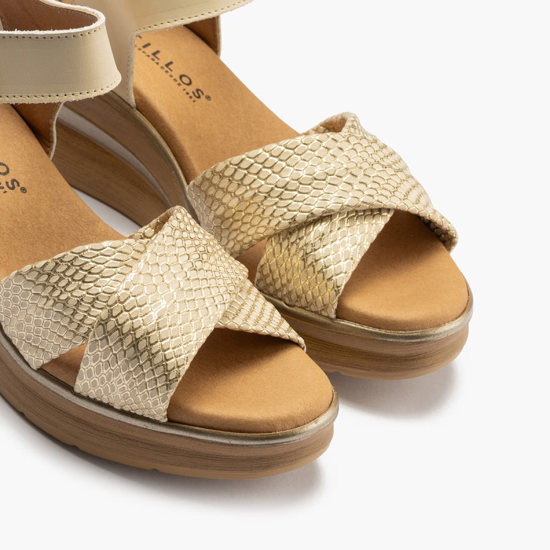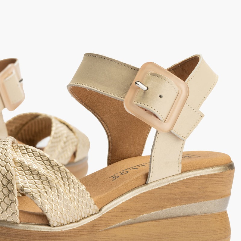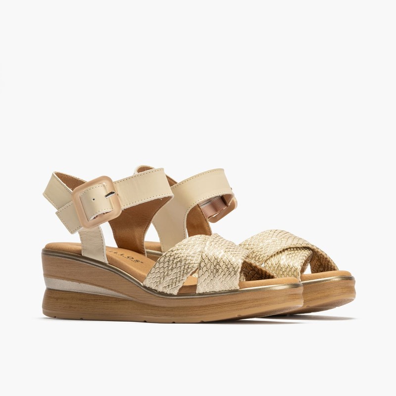 ¿Necesita ir arreglada y cómoda a la vez con un extra de anchura y el pie sujeto? Esta es la sandalia que le acompañara en sus eventos sin dejar la comodidad de lado. Piel suave dorada. Hebilla trasera solo ajústela y no la mueva. Suela cómoda con plataforma que cuidara de sus metatarsos. Elija talla habitual. Fabricada en España.