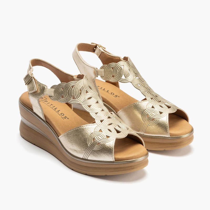 Sandalias de vestir para mujer moderna Pitillos. Cuña ligera y cómoda con plataforma delantera para evitar dolores en el metatarso. Planta acolchada. Corte precioso con calados en dorado. Sistema de hebilla para ajustar a ala medida. Calce de talla normal, recoge muy bien el pie.