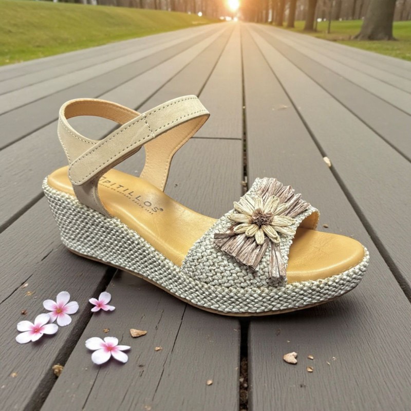 Sandalias comodísimas para lucir este verano en un color neutro que pega con todo. Confeccionadas en La Rioja por Pitillos. Modelo con cuña ligera y base cómoda con plataforma ideales para la comodidad de nuestros pies. Calce de talla habitual si duda elija la más grande. Adorno precioso con el mismo material.