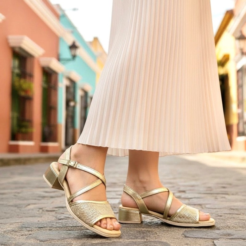 Sandalia de vestir nueva temporada para mujer de la marca riojana Pitillos. Corte fabricado en piel napa metal combinada con grabados y picados, fondo con brillo. Forradas de tejido para que no rocen. Talonera abierta con ajuste mediante elásticos hebilla que se adaptan al pie. Plantilla no extraíble. La suela es antideslizante y con un grosor plantar estupendo para no notar el suelo. Tacón de unos 5-6 cm ancho muy actual detalle dorado. Recoge muy bien el pie, perfecto para pie anchito y se adapta al juanete. Sienta muy bien en diferentes tipos de pie. Calce amplio talla habitual. Si quieres ir arreglada pero cómoda esta es tu sandalia este verano.