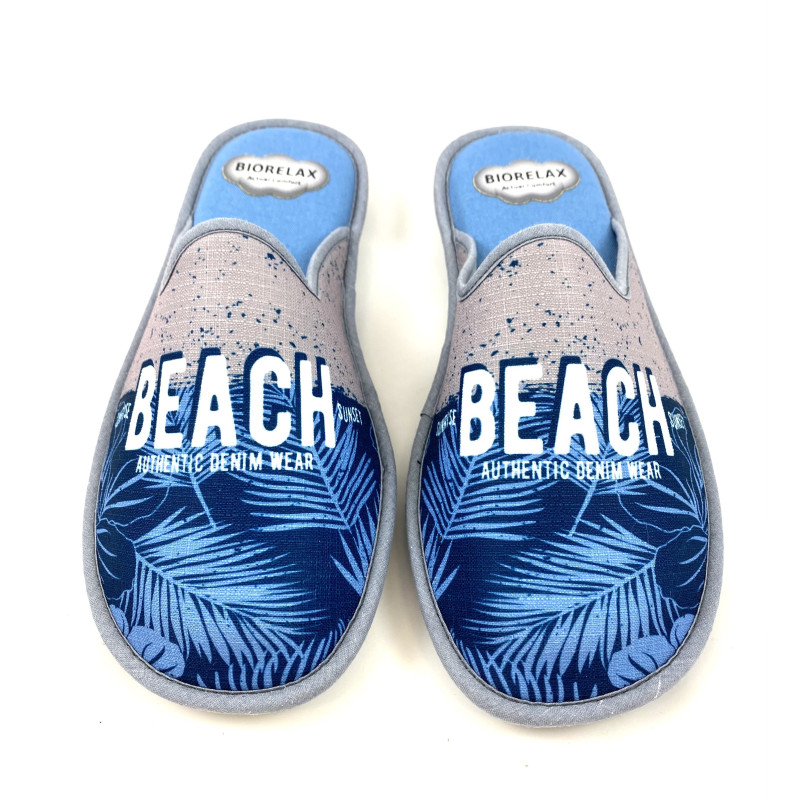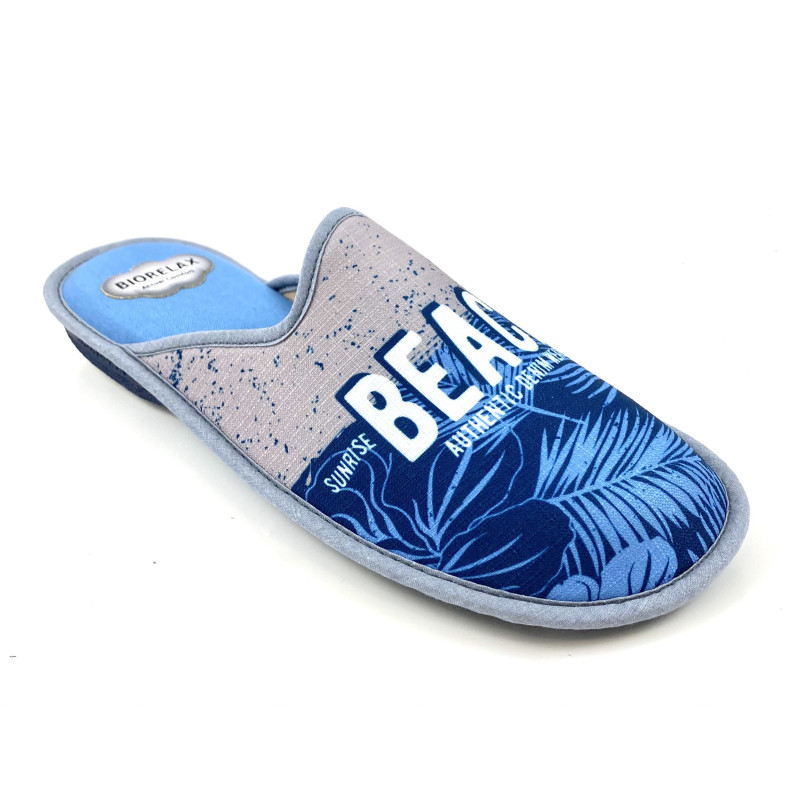 Zapatilla de casa descalza para hombre, de la marca Cosdam Biorelax en color azul. Fabricada en material textil de primera calidad tanto el exterior como el interior, 100% transpirable. Diseño ideal para los amantes de los viajes, la playa, el surf... Plantilla al tono con efecto Biorelax para ofrecer el mejor descanso a tus pies, con el nombre 'Biorelax' grabado en ella. Suela de goma antideslizante. Hecha en Arnedo La Rioja. Calce talla normal.