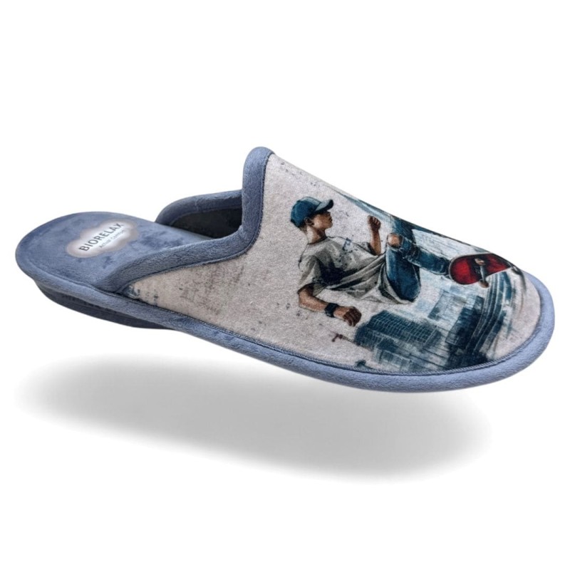 Zapatilla de casa muy bonita, acolchada para chico, fabricada por la marca Riojana Cosdam Biorelax. Este modelo lleva el acolchado técnico Biorelax que flota viscoelástico muy cómoda. Tejido de alta calidad tipo pelo, con estampado espacial precioso y frase " Papi te quiero hasta la luna ida y vuela". Suela de caucho natural antideslizante, calza muy bien al meter el pie, calce habitual. Fácil limpieza. Hecho en España. Plantilla no extraíble. Tejido invernal suave para otoño-invierno con estampado duradero. Color gris como en la fotografía.