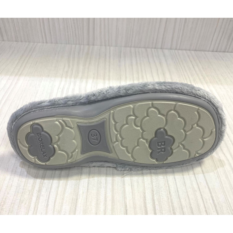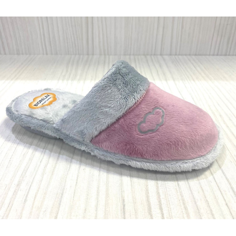 Zapatilla de casa para mujer Cosdam Biorelax. Fabricada en materiales de alta calidad en La Rioja. Tejidos transpirables, interior pelo calentito y plantilla normal no extraíble, exterior tipo lana gris y rosa con brillo. Suela de caucho natural, vulcanizada con calor y totalmente antideslizante. Pequeña cuña. Calce normal. Hecho en España.