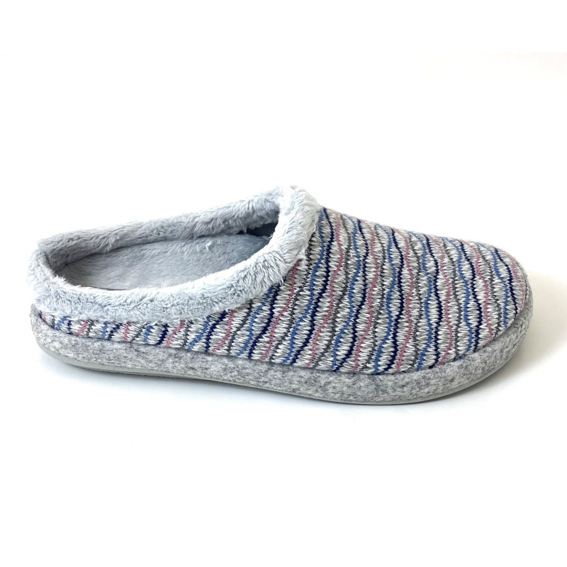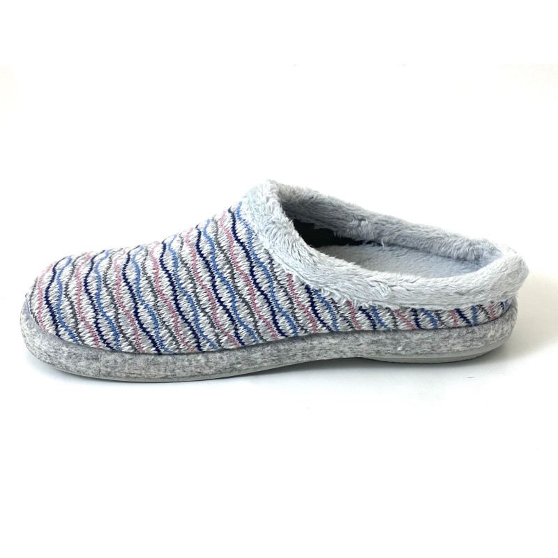 Zapatilla de casa de la marca Riojana Biorelax. Fabricada en tejido suave transpirable con estampado. Pelo suave en el empeine, suela de caucho antideslizante y planta acolchada amortiguadora. Hecho en España. Calza la talla habitual.