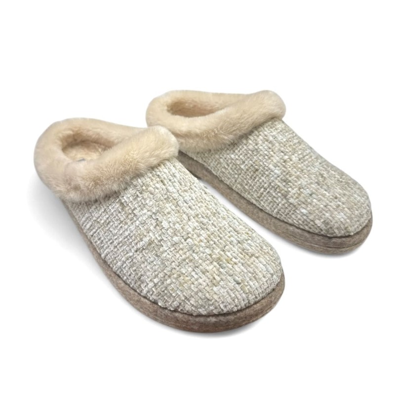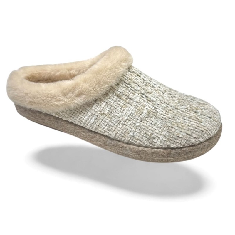 Zapatillas para casa de mujer otoño-invierno de la marca riojana Cosdam. Confeccionada en materiales de primera calidad. Tejidos de invierno jaspeados con pelo muy suave en el contorno. Plantillas extraíbles finas de pelo. Suela gordita antideslizante. El calce de la zapatilla es amplio.