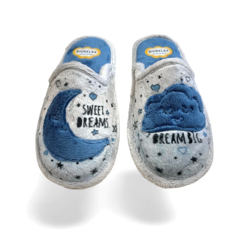 Zapatilla de casa de la marca Riojana Biorelax. Fabricada en tejido suave transpirable con estampado. Pelo suave en el empeine, suela de caucho antideslizante y planta acolchada amortiguadora. Hecho en España. Calza la talla habitual.