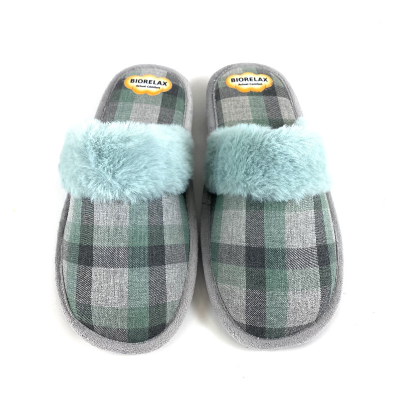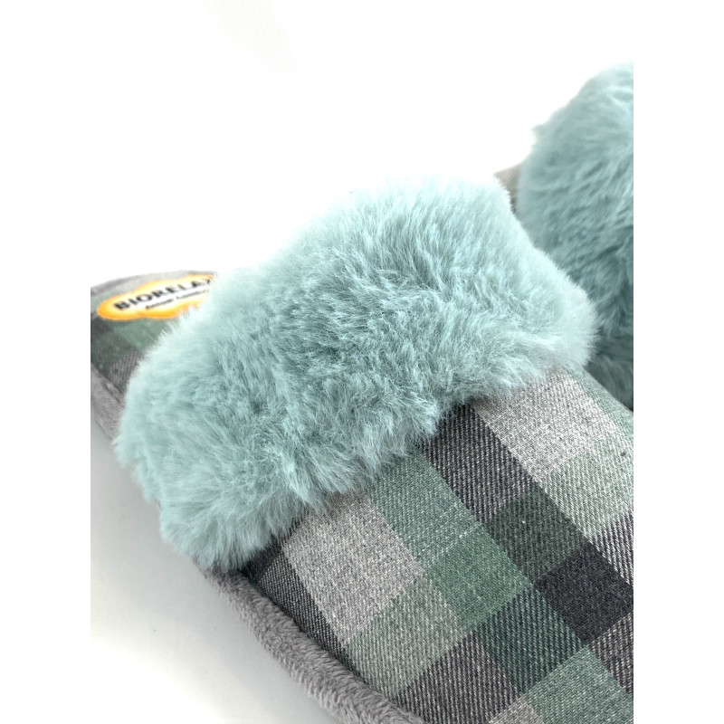 Zapatilla de casa para mujer con planta acolchada viscoelástica de fácil recuperación, amortigua la pisada en cada paso. Fabricada por la marca Riojana Biorelax. Confeccionada en tejido de pelo invernal combinado de motas azules para la nueva colección otoño. Suela de caucho natural antideslizante y ligera con una pequeña cuña. Calce normal-amplio. Hecho en España.
